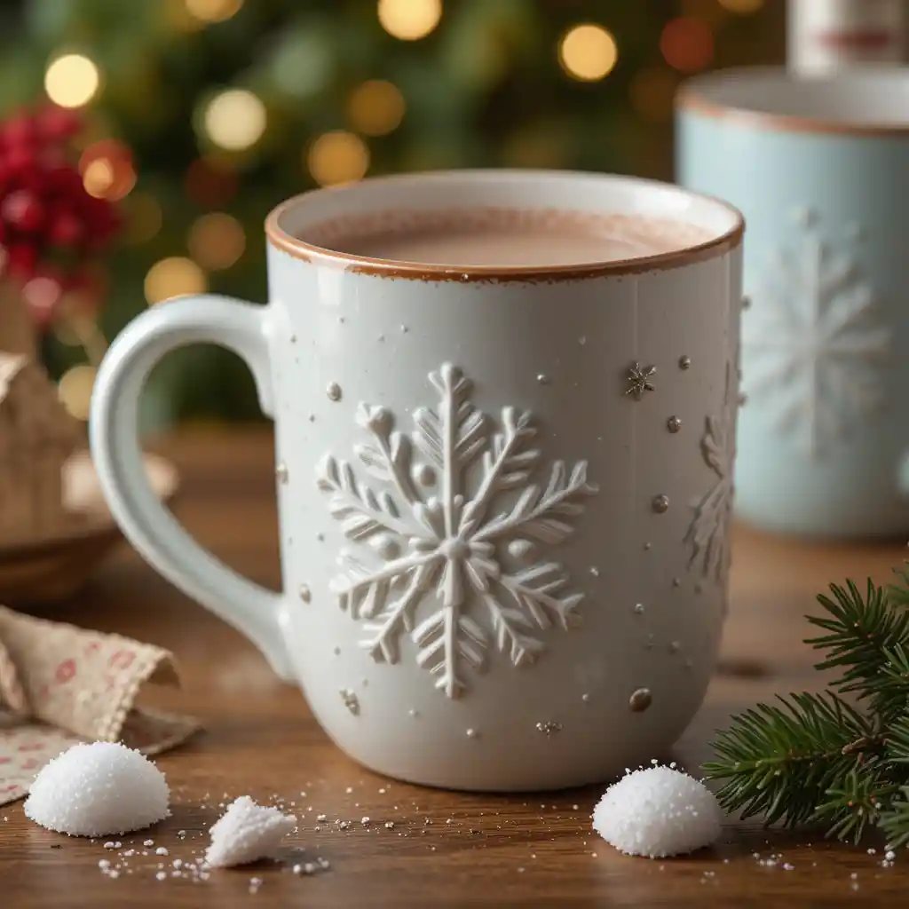 A snowflake design mug gives a wintry touch. The raised pattern adds texture and charm to your holiday drinkware. Christmas Mug Ideas