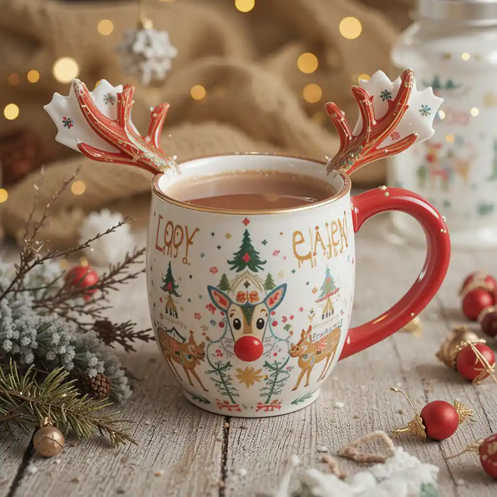 A playful reindeer mug with antler handles adds fun to your morning drink. Kids especially love this whimsical design. Christmas Mug Ideas