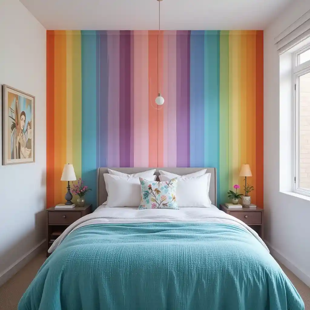 Paint one wall in vertical or diagonal rainbow stripes. This acts as a focal point and instantly brings a burst of color to a neutral room.
