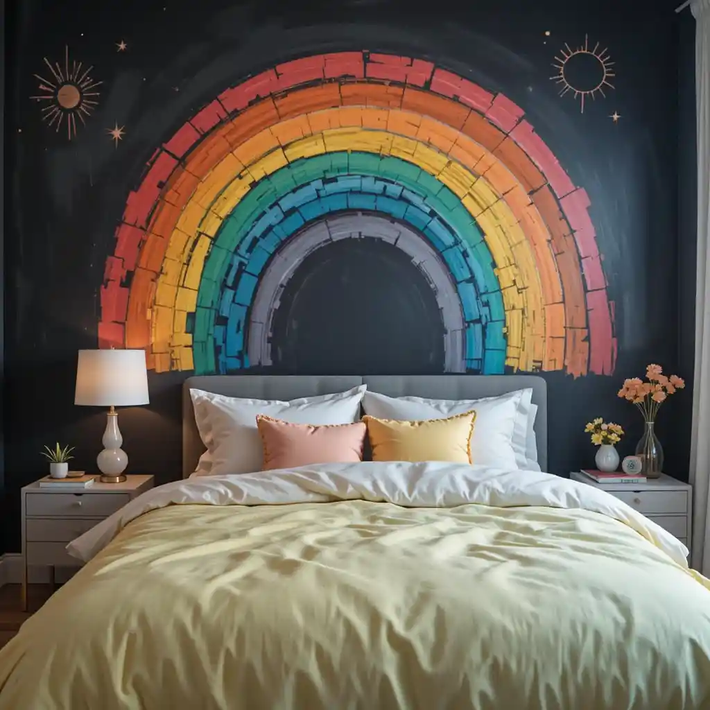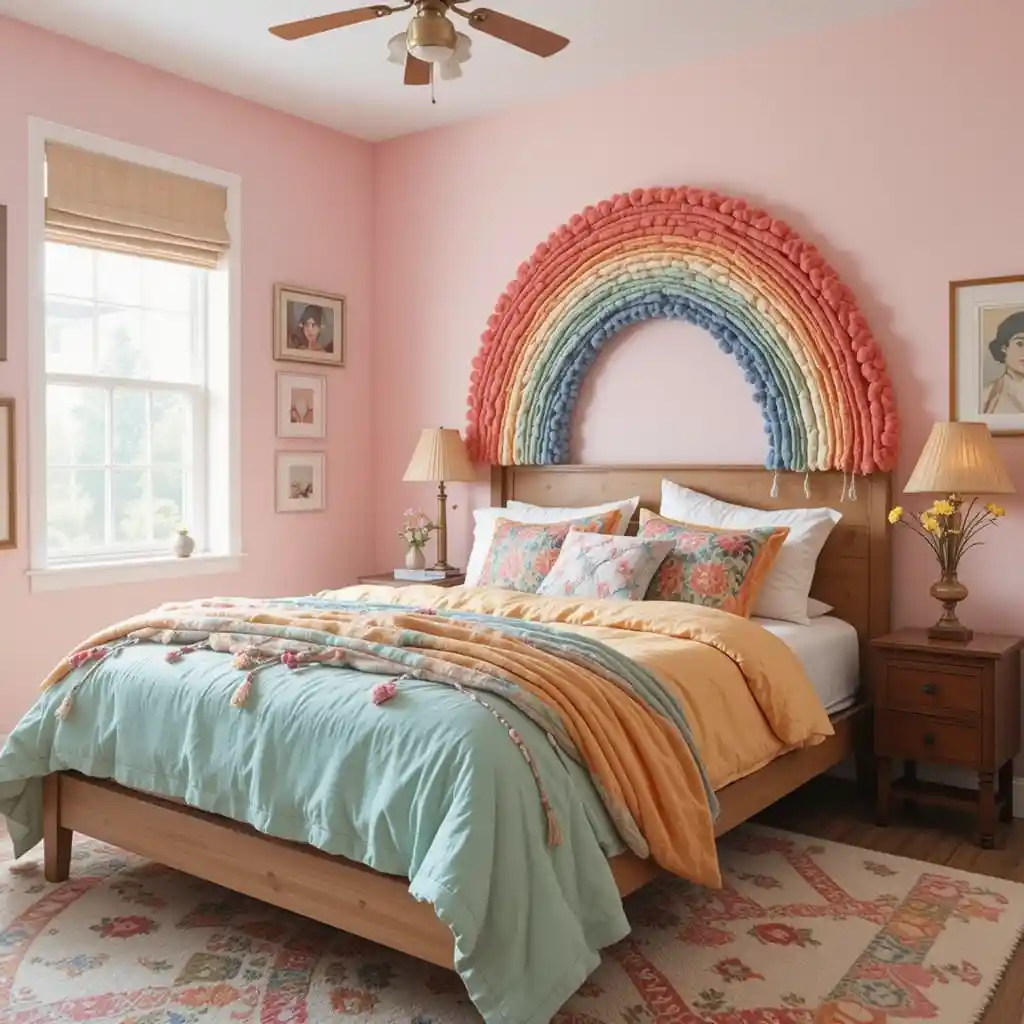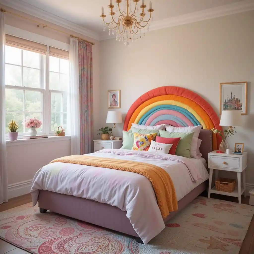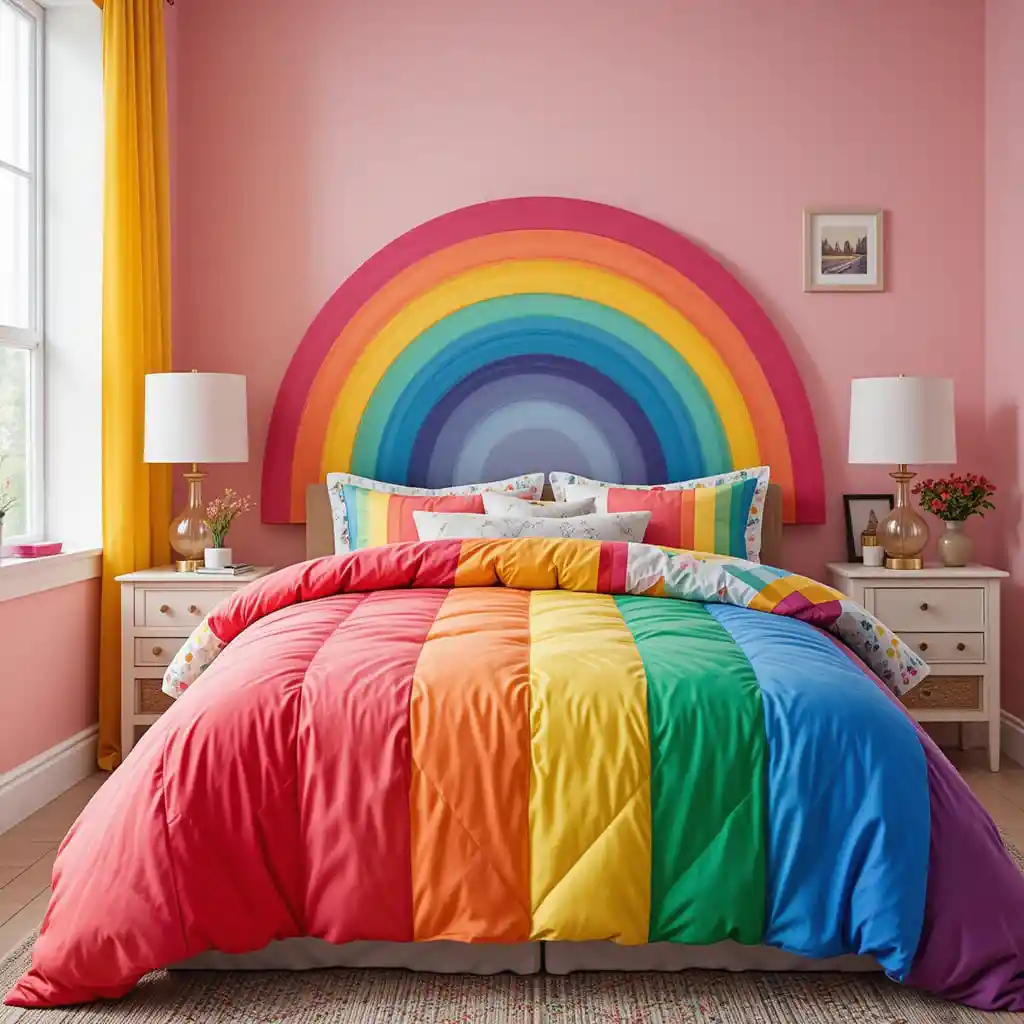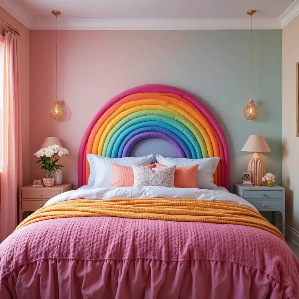 DIY or buy a rainbow-patterned headboard to create a striking focal point for your bed. This adds both comfort and color to your sleeping space. Rainbow Bedroom Ideas