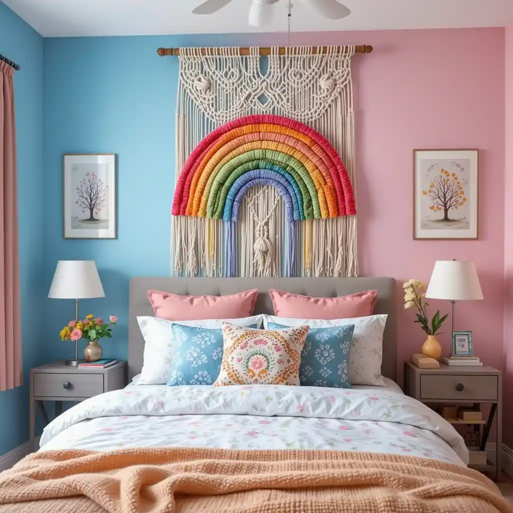 Add a handmade rainbow macramé above your headboard. This brings texture, warmth, and a boho touch to your space. Rainbow Bedroom Ideas
