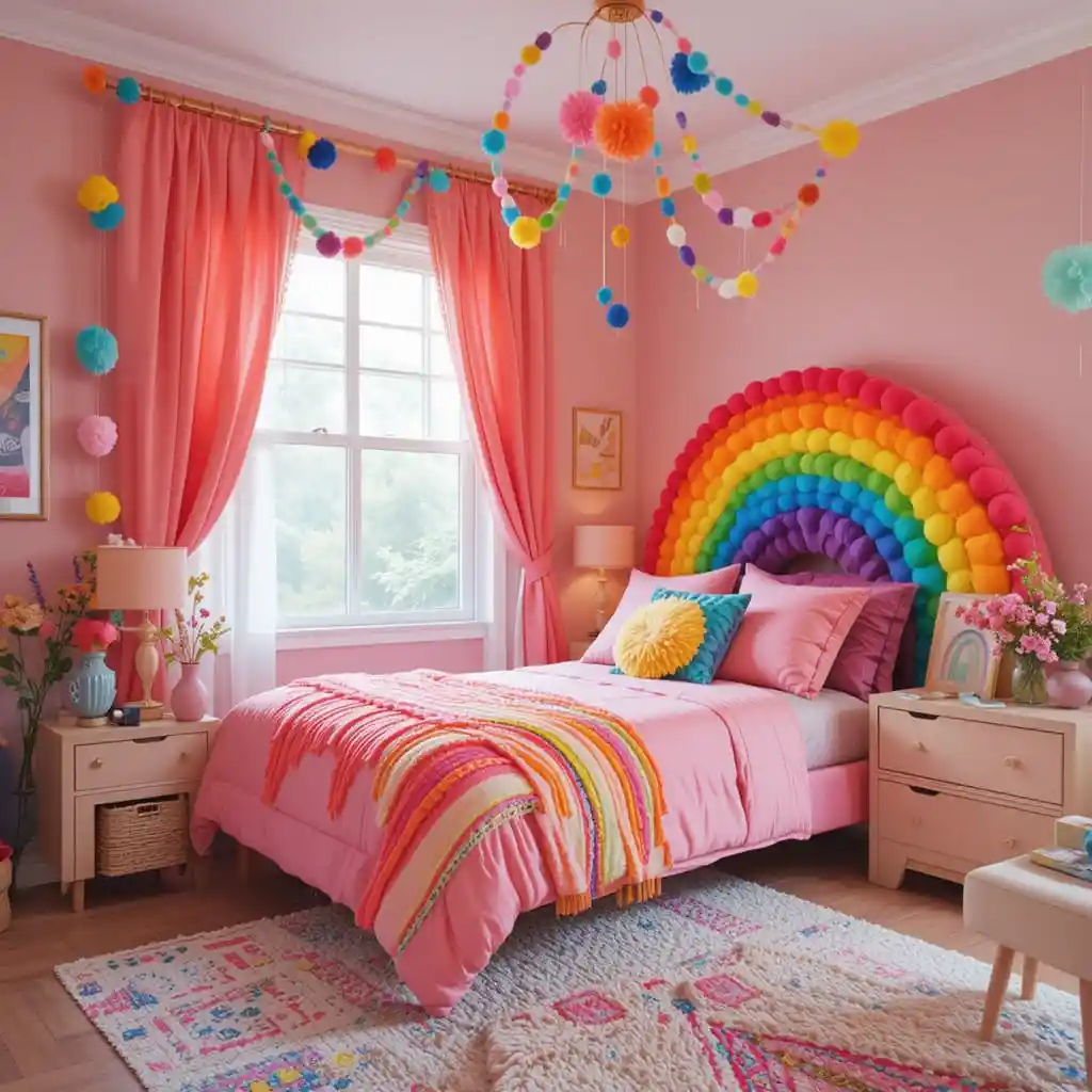 String up rainbow pom-pom garlands around your room for a fun and whimsical decoration that’s easy to hang and remove.Rainbow Bedroom Ideas
