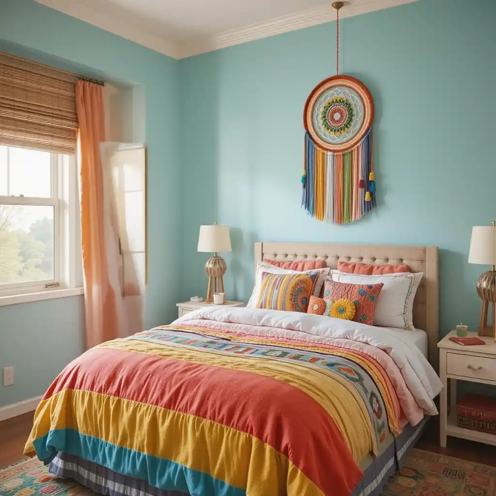 Hang a colorful dreamcatcher made with rainbow yarns and beads near your bed for a charming and protective touch.