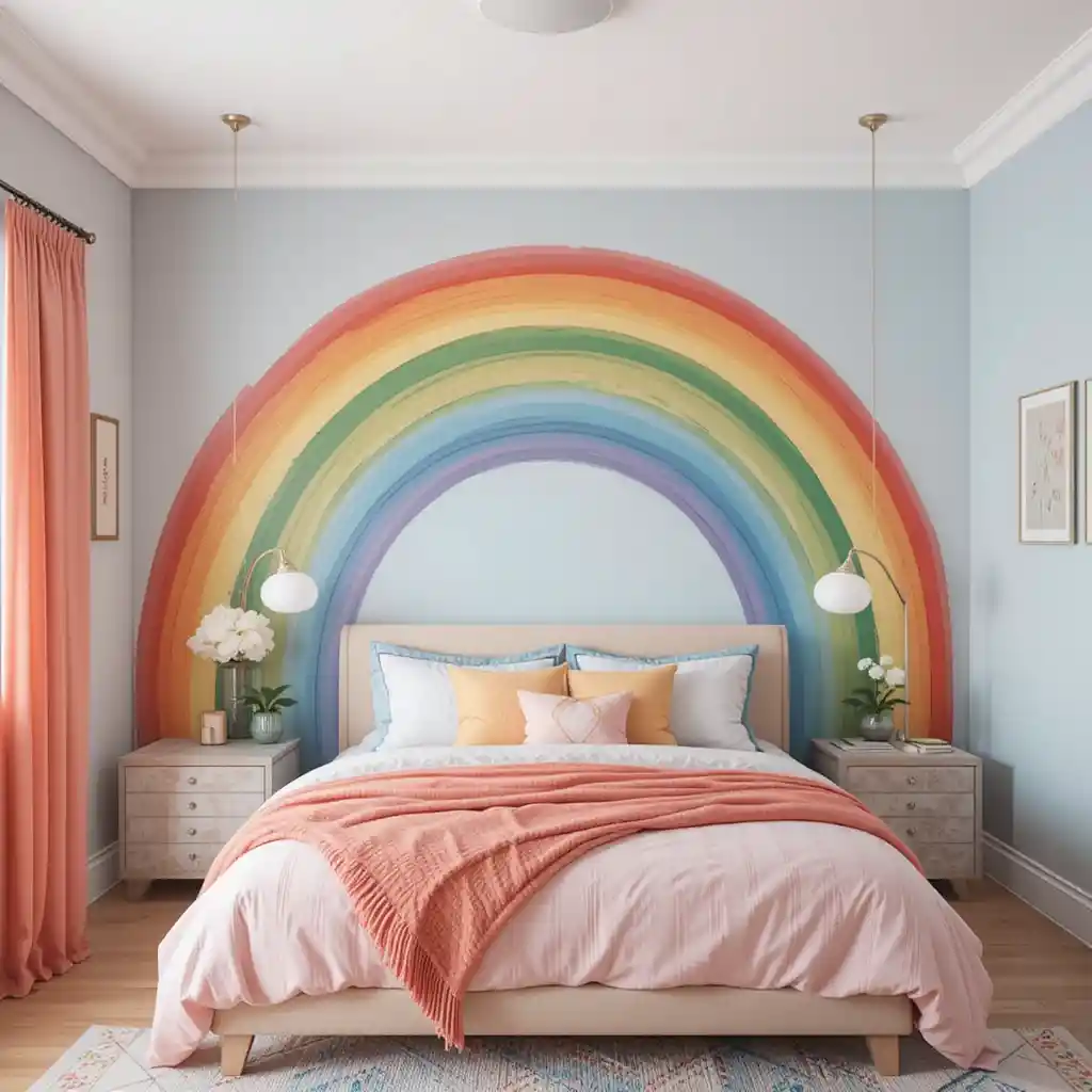 Apply a rainbow mural wallpaper to an entire wall for a dramatic and high-impact transformation. Choose abstract or cartoon styles depending on your preference. Rainbow Bedroom Ideas