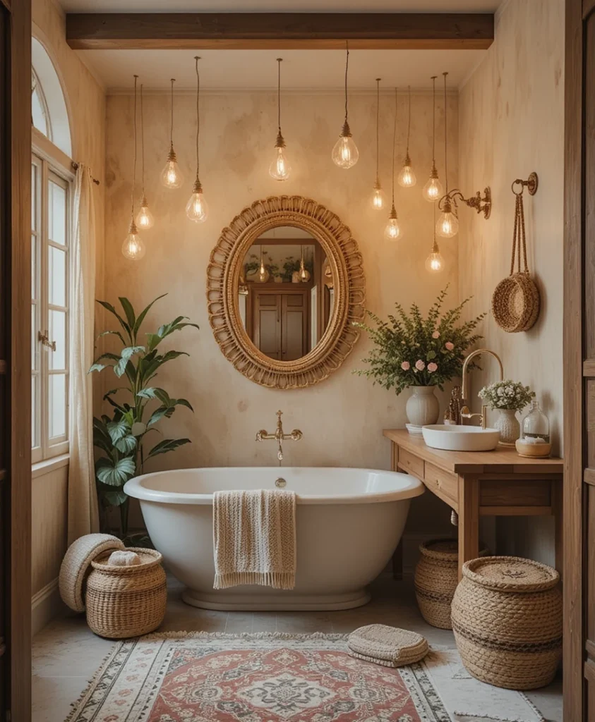 Hang string lights or wicker pendant lamps to create cozy evening ambiance. Warm lighting enhances the earthy tones and adds that dreamy boho glow. Boho Bathroom