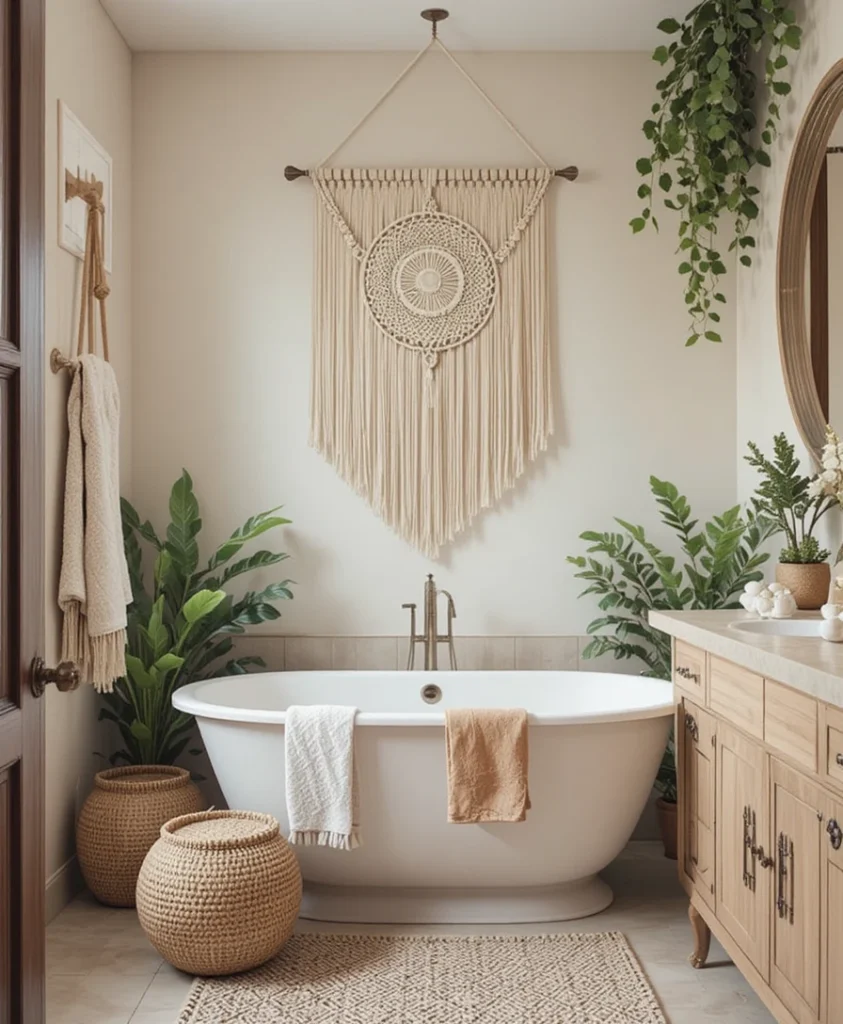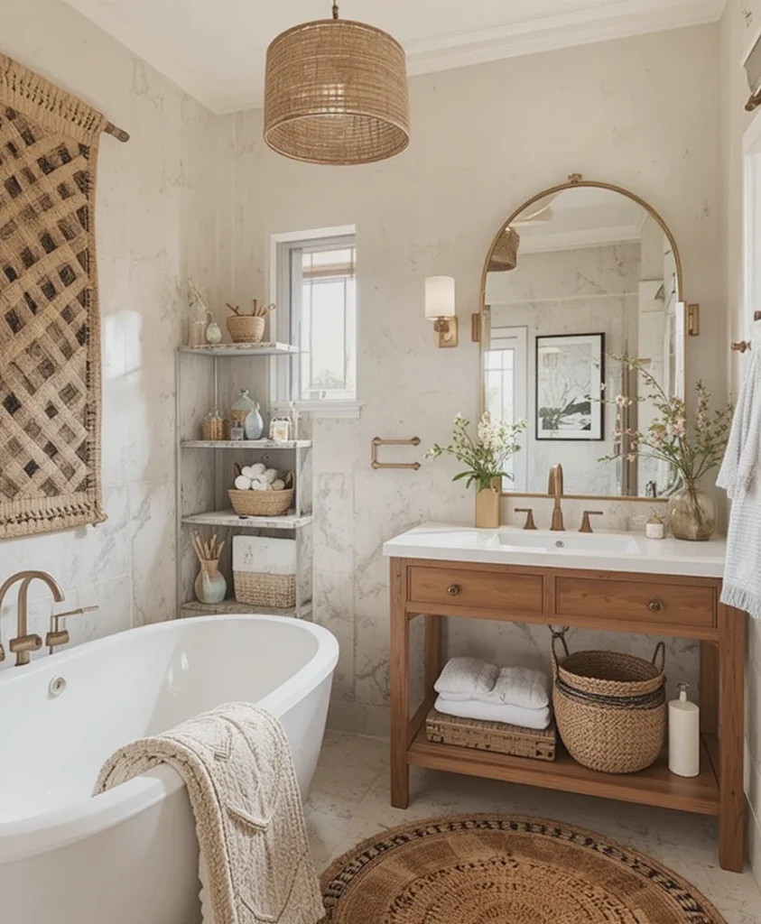 Use woven baskets to organize towels, skincare, or plants. The natural texture instantly adds warmth and gives your bathroom an earthy bohemian feel. Boho Bathroom