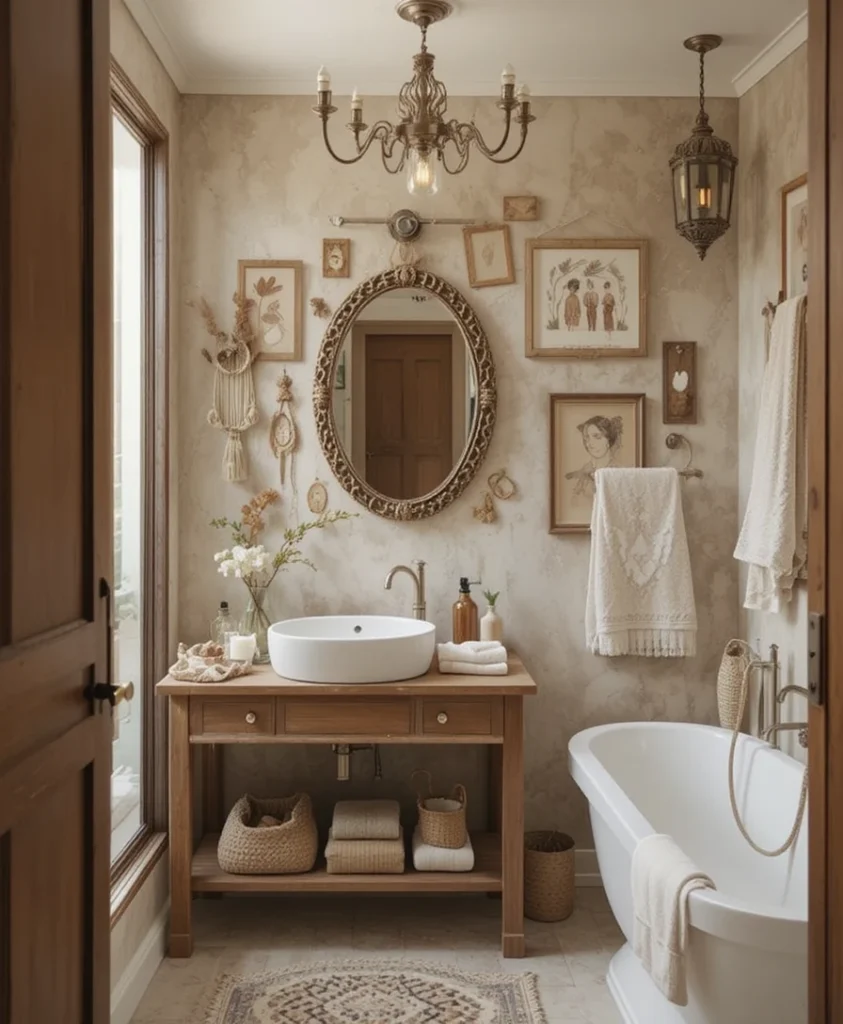 Hang nature-inspired prints, tribal art, or abstract sketches in mix-and-match frames. This adds soul and makes your bathroom feel like your personal retreat. Boho Bathroom