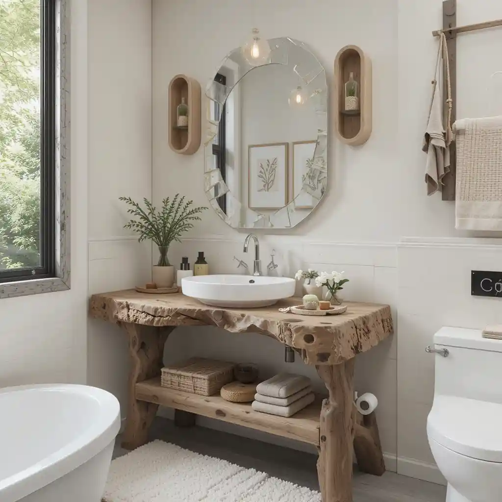 A live edge wooden vanity adds rustic charm and a natural focal point to your bathroom. The raw, organic shape brings warmth and uniqueness to the space. Natural Elements in Bathroom Décor Ideas