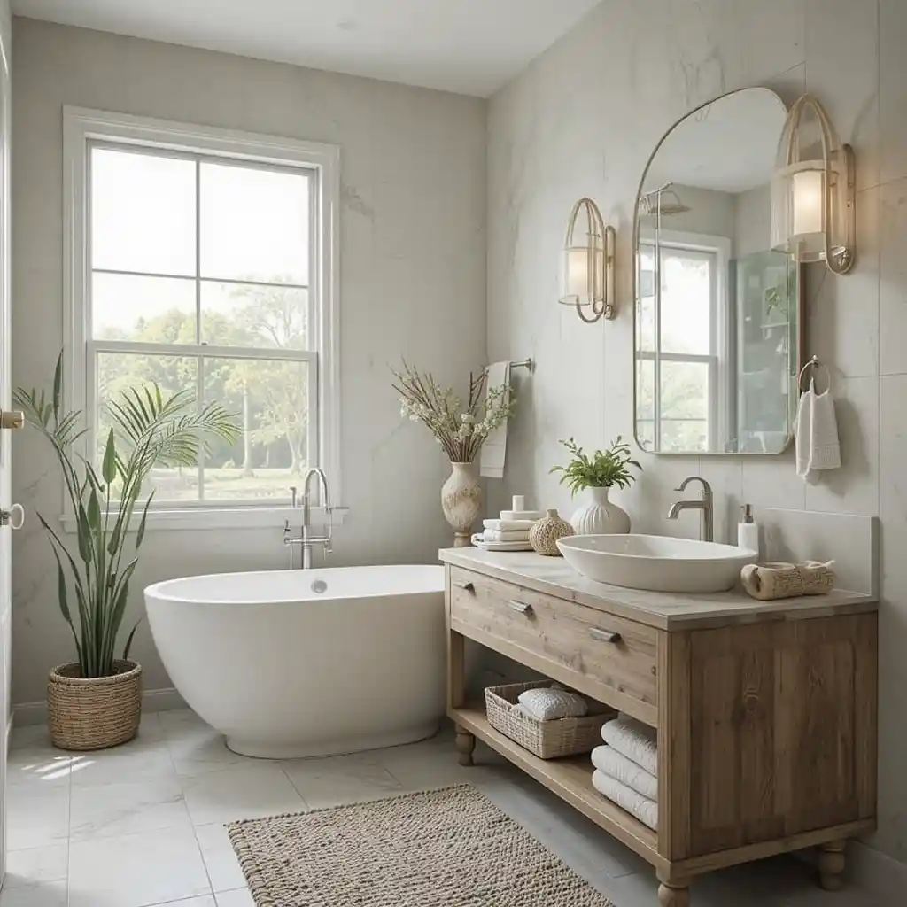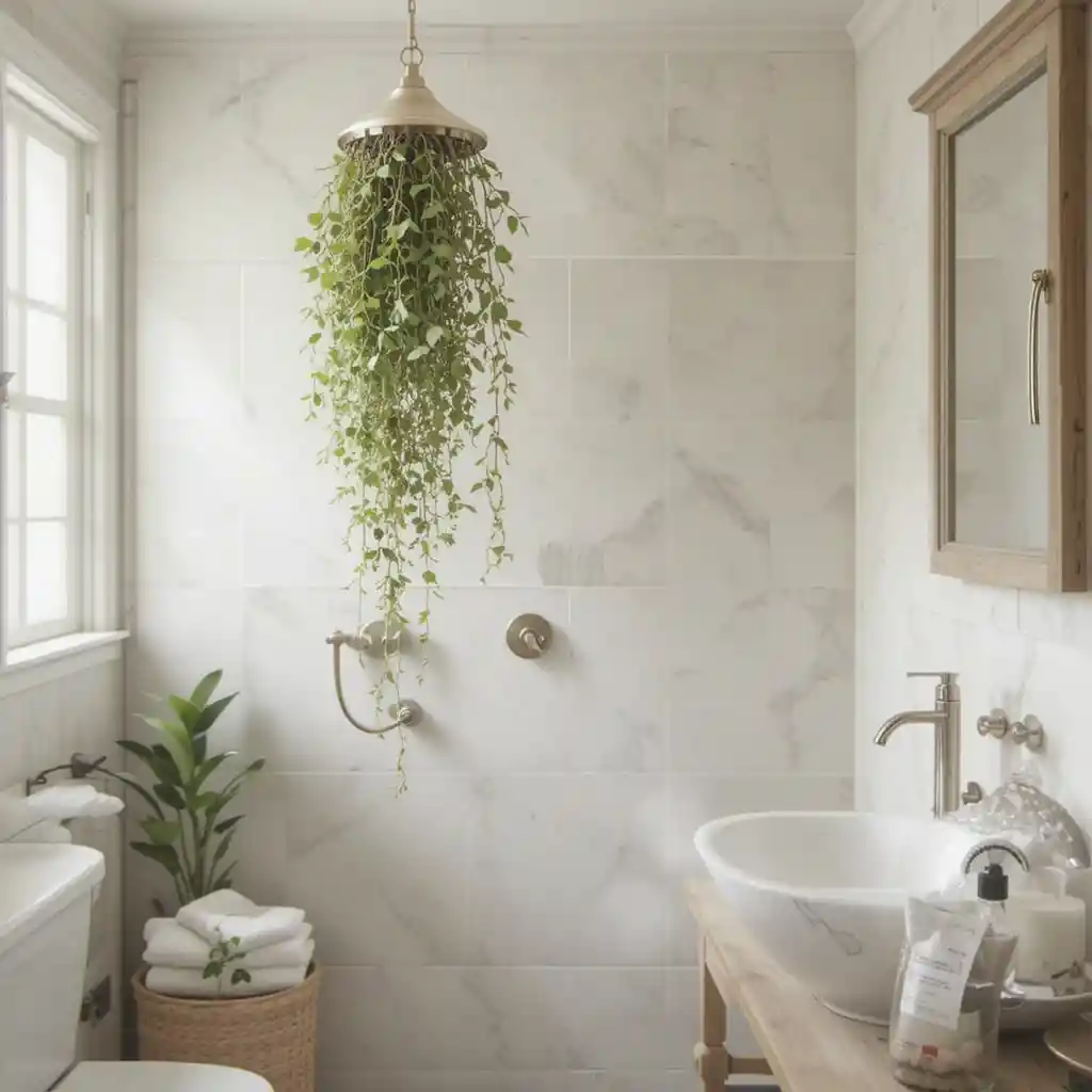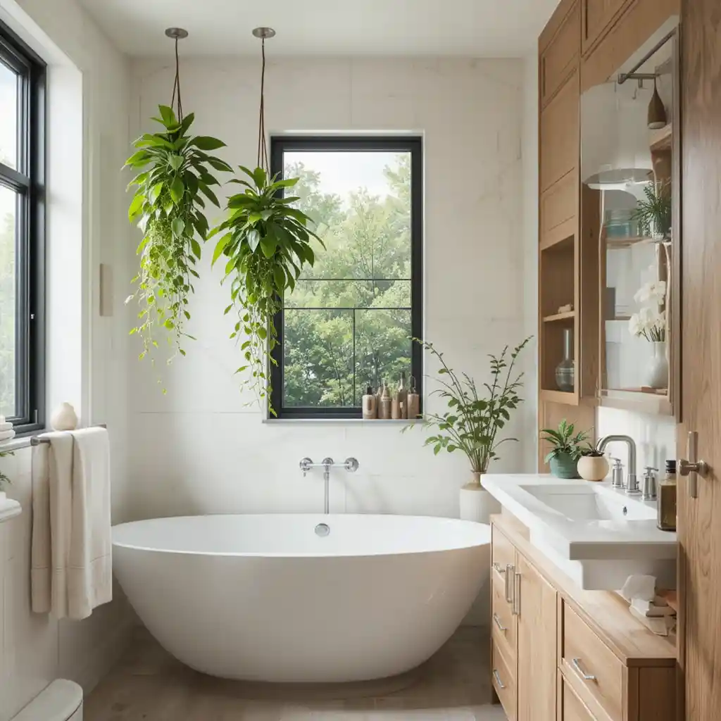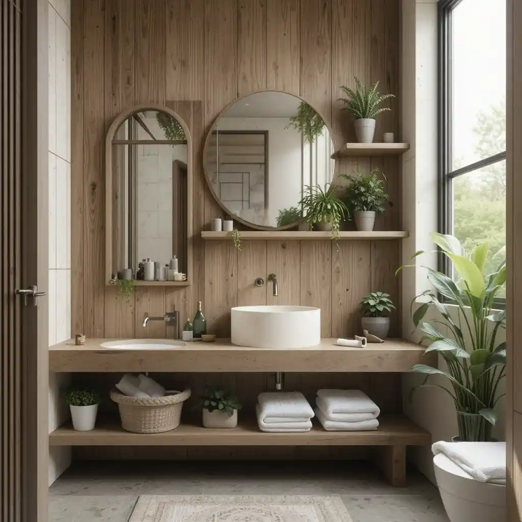 Place small potted plants like ferns or succulents on open shelves. They purify the air and create a fresh, natural vibe. Natural Elements in Bathroom