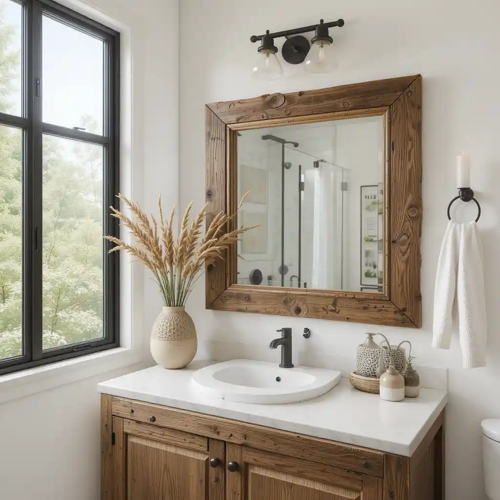 Add a mirror framed with reclaimed wood for a rustic look that balances modern fixtures. It adds character and sustainability to your décor.