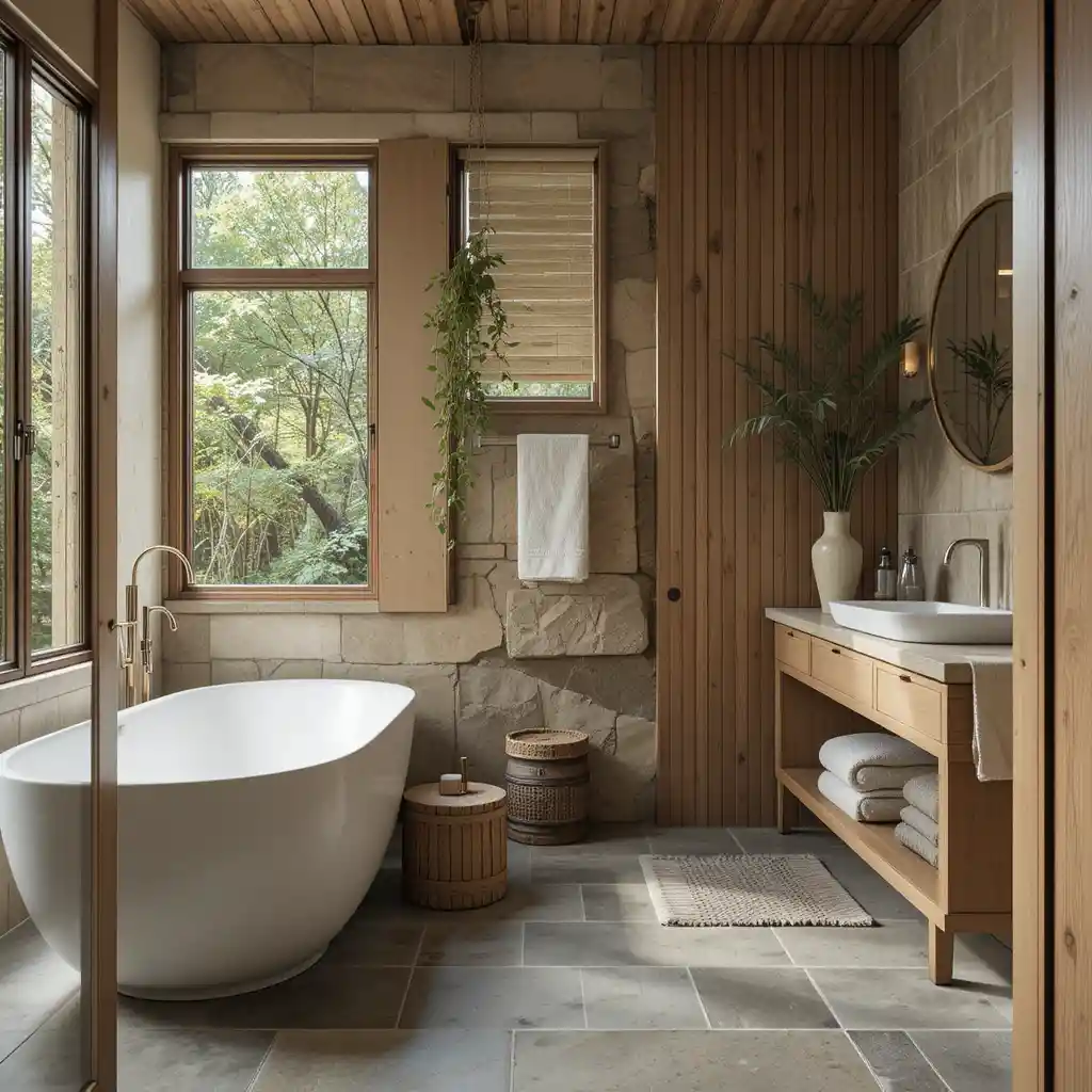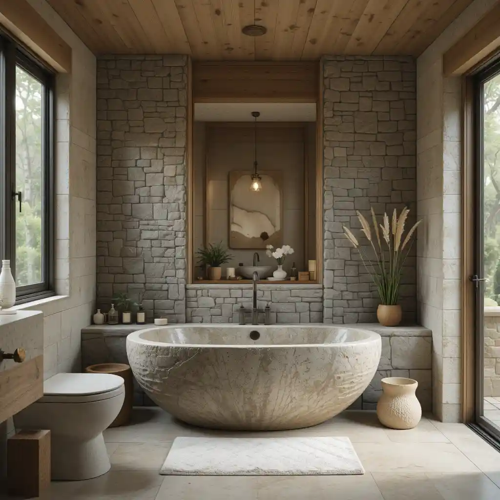A freestanding stone tub or a stone-tiled surround brings luxury with a natural twist. It’s perfect for creating a serene bathing experience.