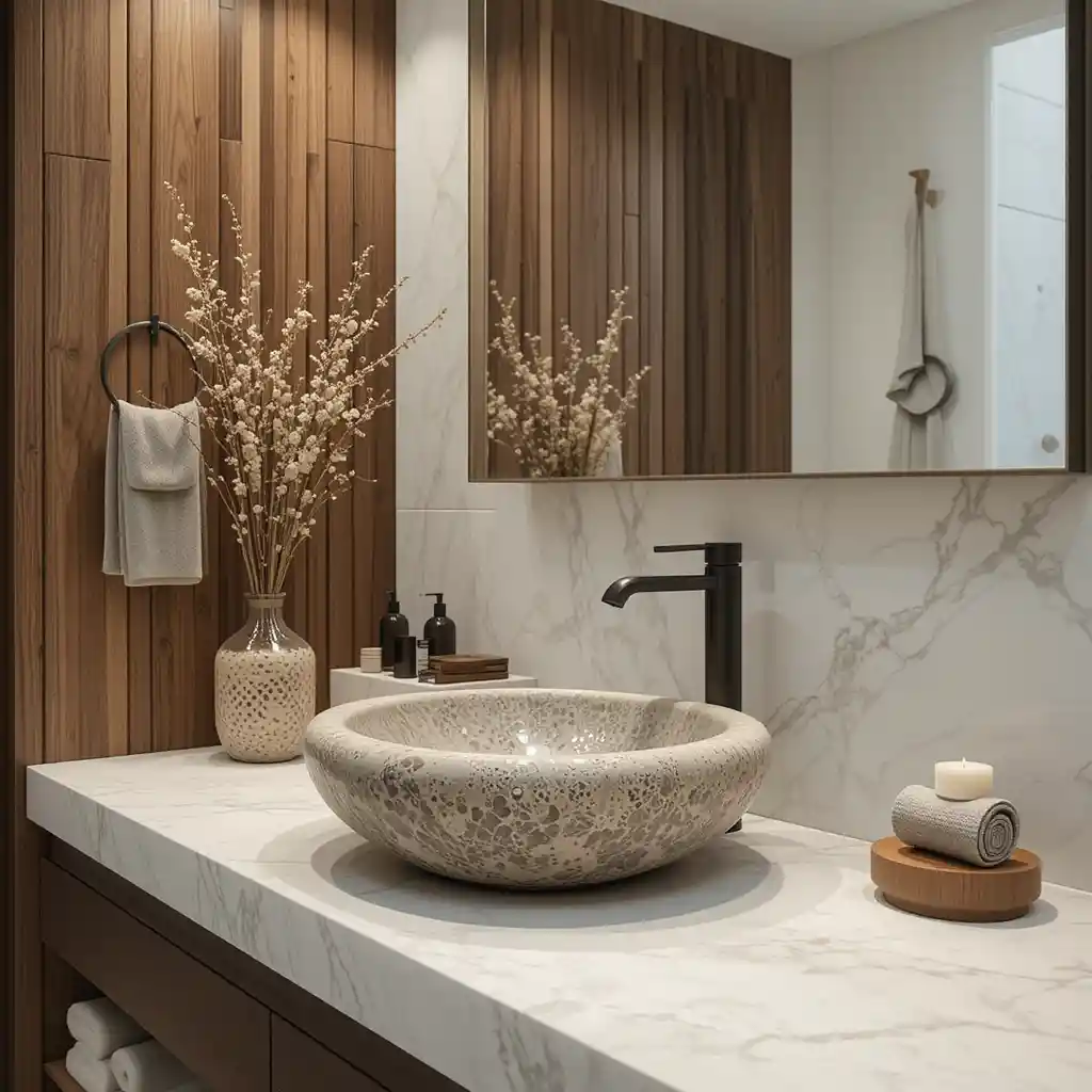 Choose a vessel sink made from natural stone like river rock or marble. Its raw texture adds depth and a spa-like luxury to your countertop.