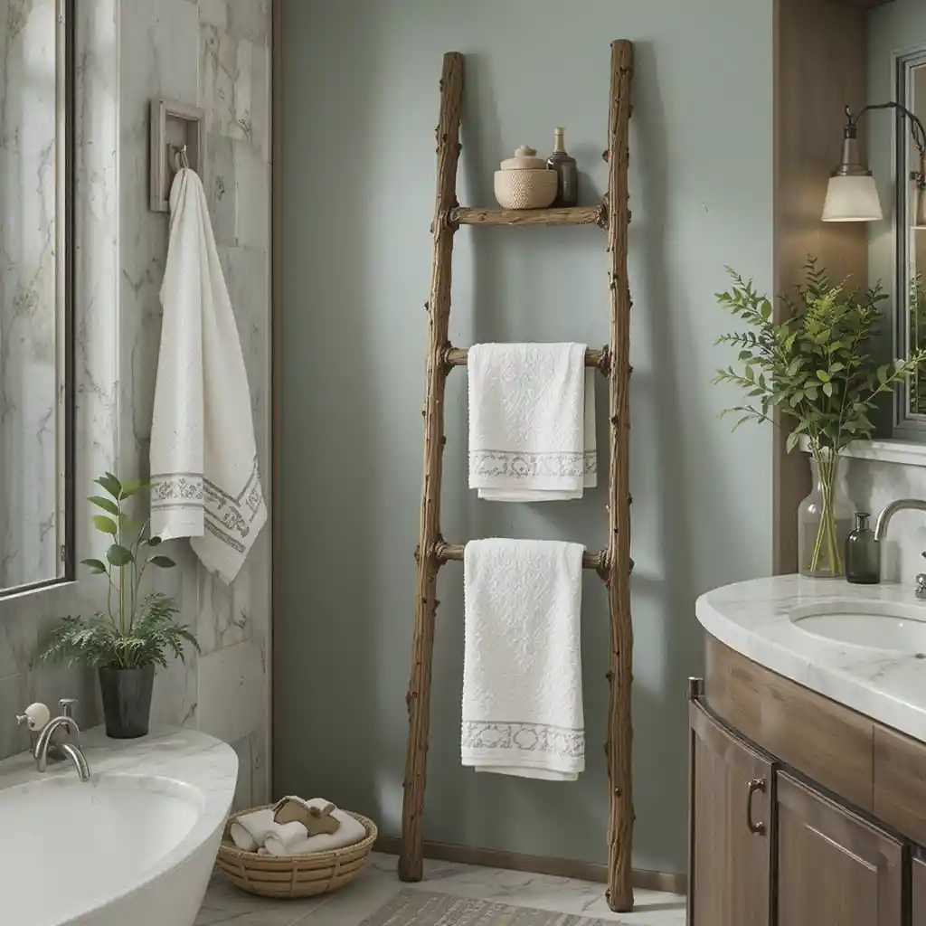 Replace a metal rack with a leaning wooden ladder to hang towels. It adds rustic charm and doubles as décor.