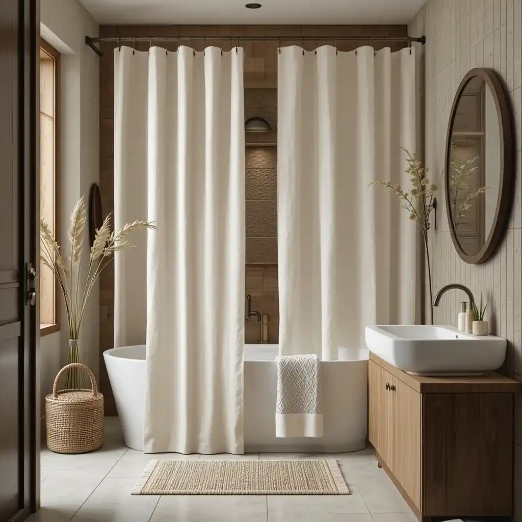 A shower curtain made from flax linen or cotton adds softness and breathability. Opt for neutral colors for a light and airy feeling.