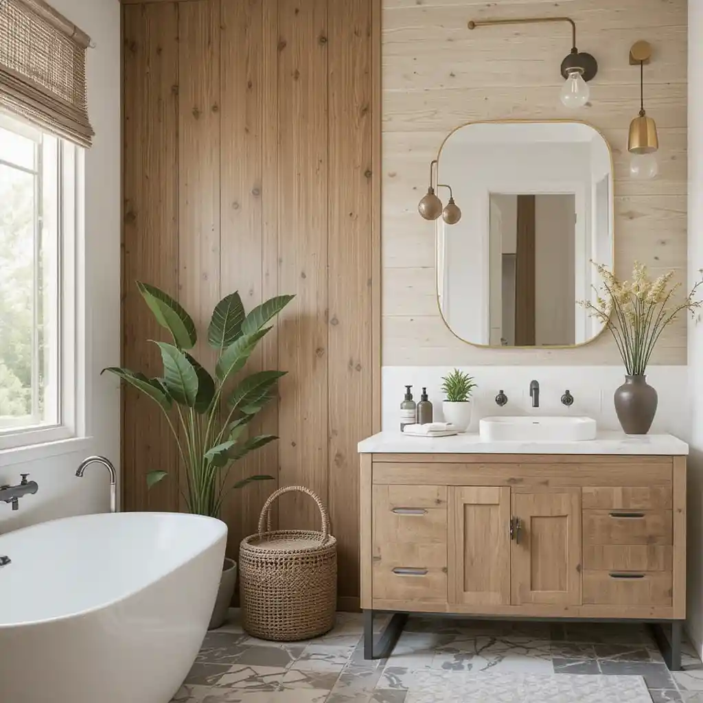 Line one wall with natural wood or shiplap panels for warmth and texture. Cedar or reclaimed wood is especially great for bathrooms.