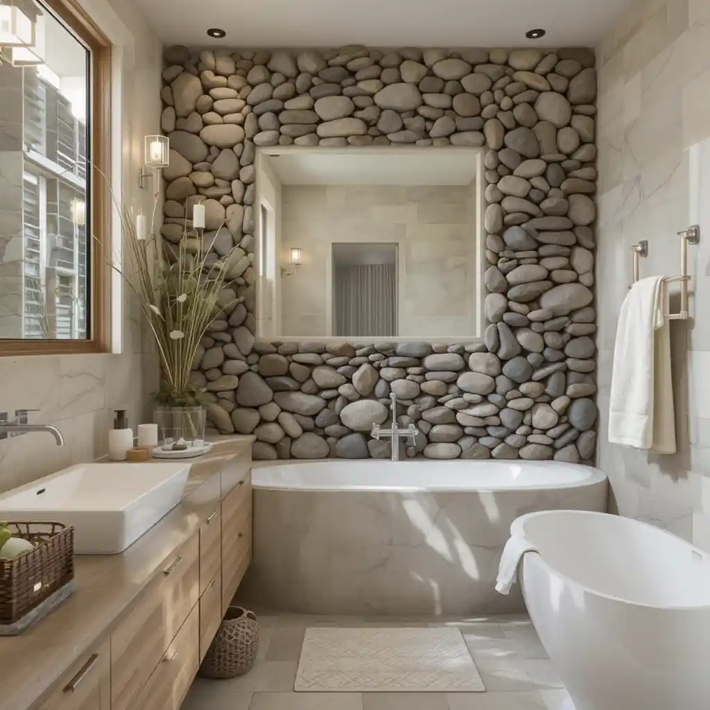 Create a statement wall using smooth river rocks. It enhances the feeling of being surrounded by nature and adds a spa aesthetic.