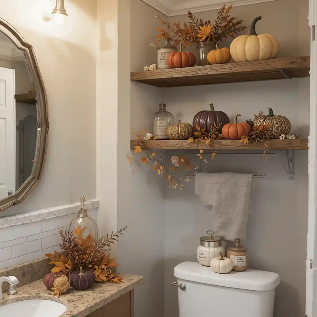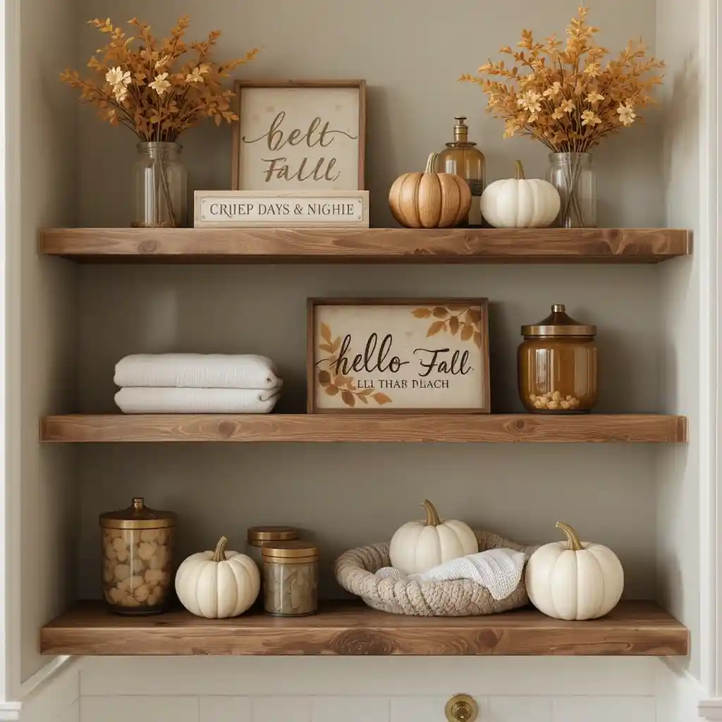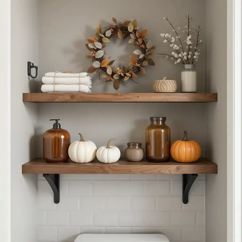 Frame or lean small fall prints featuring pumpkins, forests, or quotes in muted tones to make the shelves feel curated and cozy. Fall Bathroom Shelf Decor
