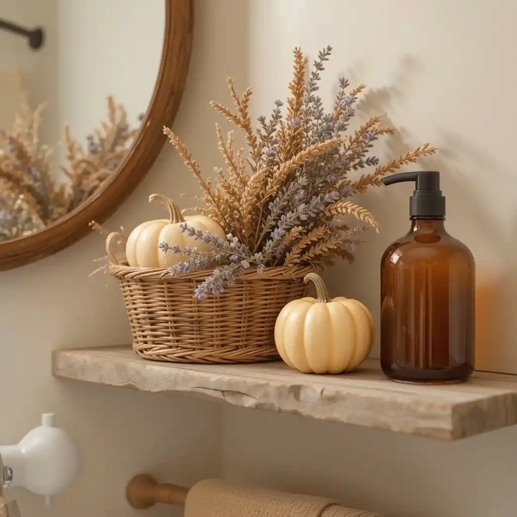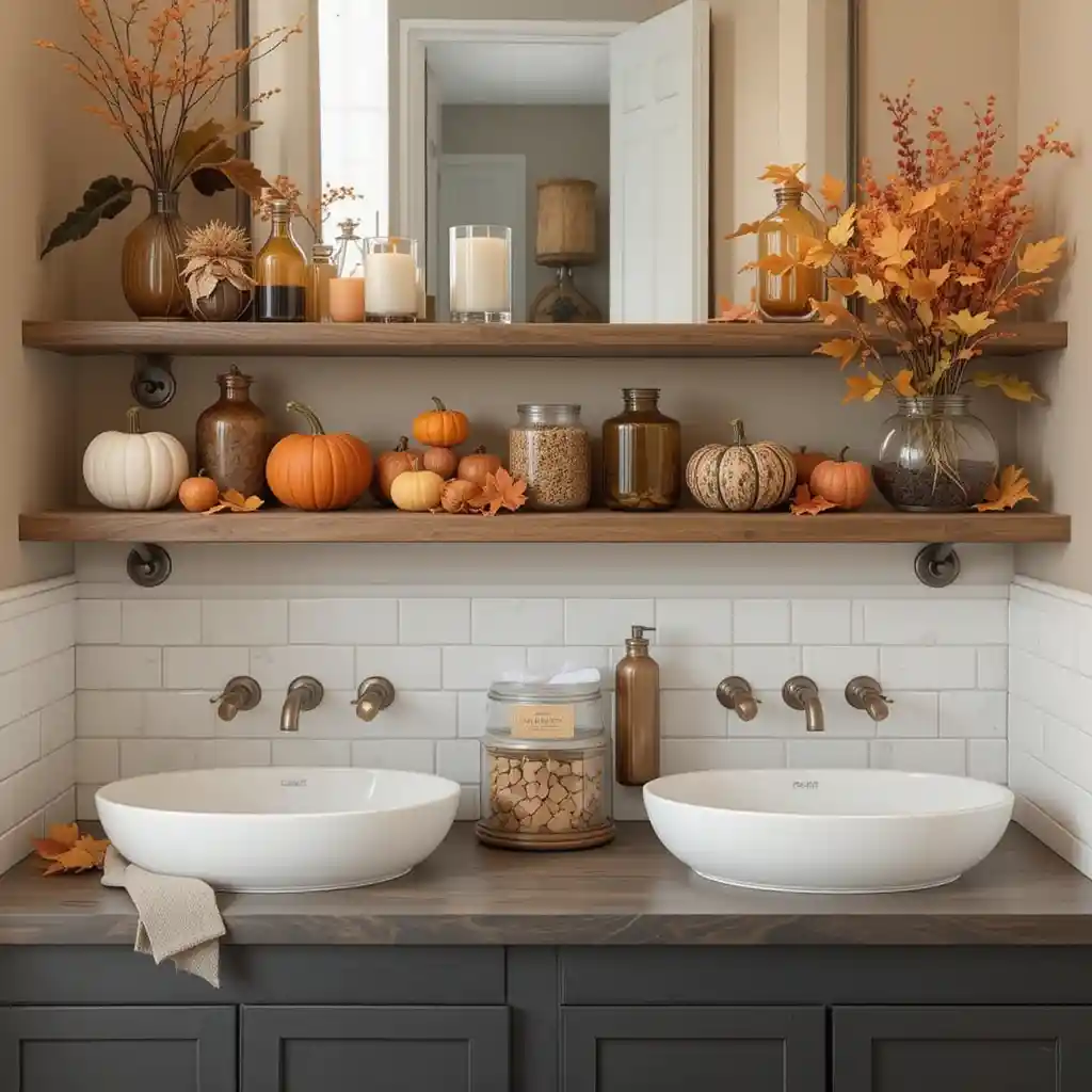 Replace your regular soap pump with a ceramic or plastic pumpkin-shaped dispenser that adds charm and functionality to your fall decor. Fall Bathroom Shelf Decor