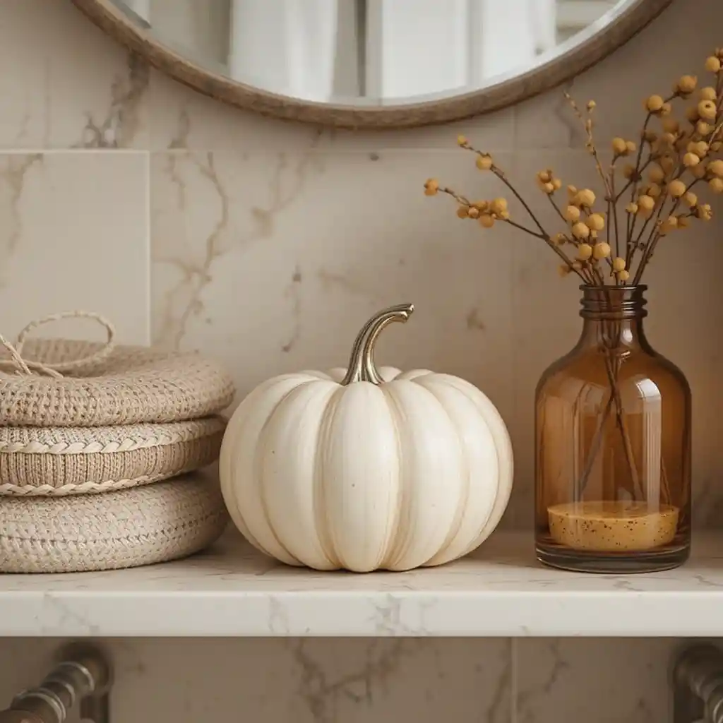 A minimalist white or beige ceramic pumpkin can be a chic addition to your shelf, adding a soft seasonal nod without clashing with bathroom decor.