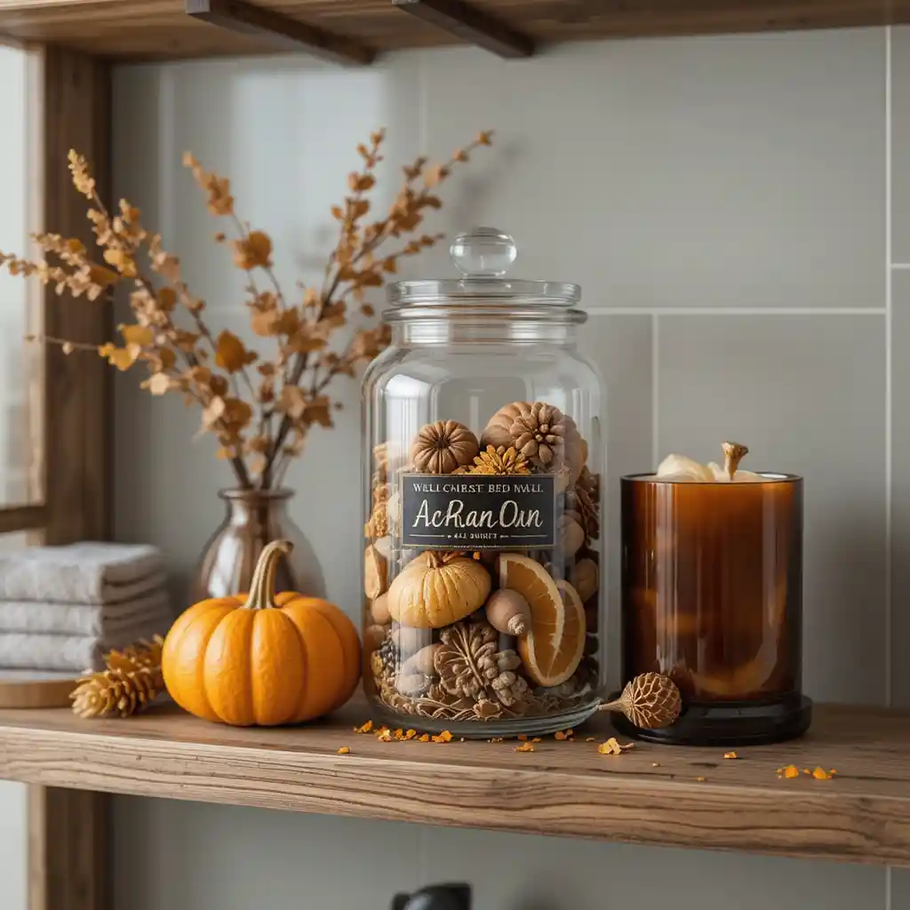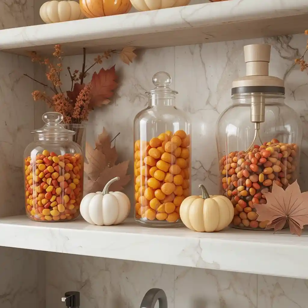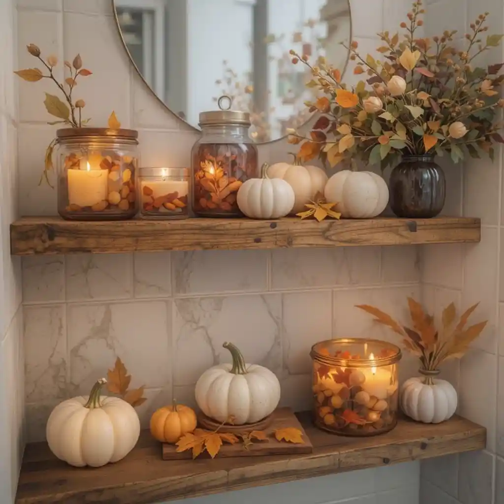 Fill clear apothecary jars with candy corn, dried berries, or orange beads to reflect the colors of the season while staying stylish. Fall Bathroom Shelf Decor