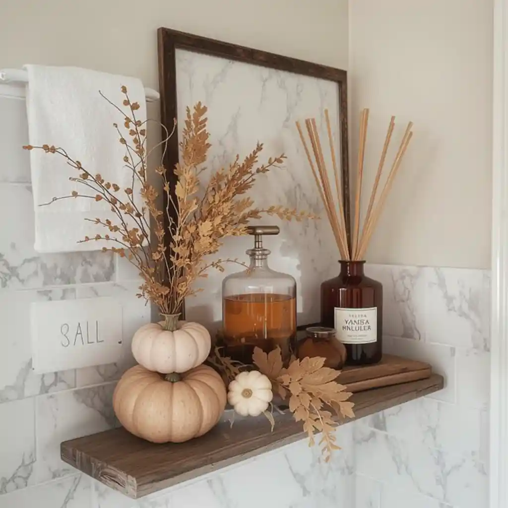 Add a reed diffuser in a warm fall fragrance like spiced vanilla or clove to create an inviting scent and beautiful visual on your shelf. Fall Bathroom Shelf Decor