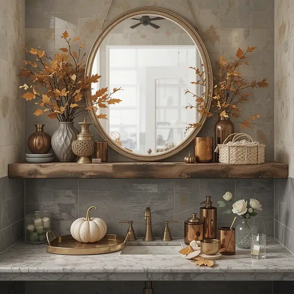Include wooden trays, risers, or framed prints to add rustic autumn vibes and break up sterile bathroom surfaces.