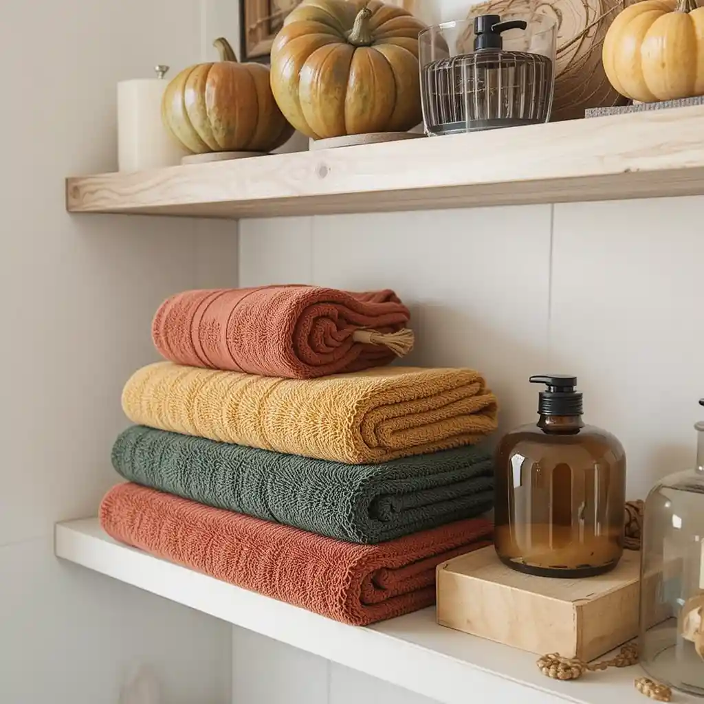 Display a few neatly rolled or folded towels in colors like rust, forest green, or mustard to make even your linens feel seasonally updated.