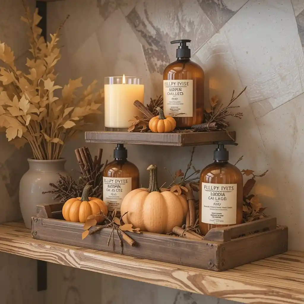 Use a tiered tray or shelf insert to create a styled vignette with pumpkin candles, cinnamon sticks, and fall-scented lotions arranged by height.