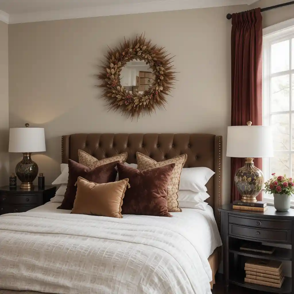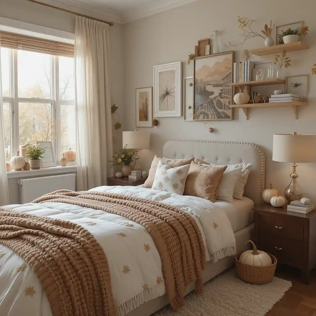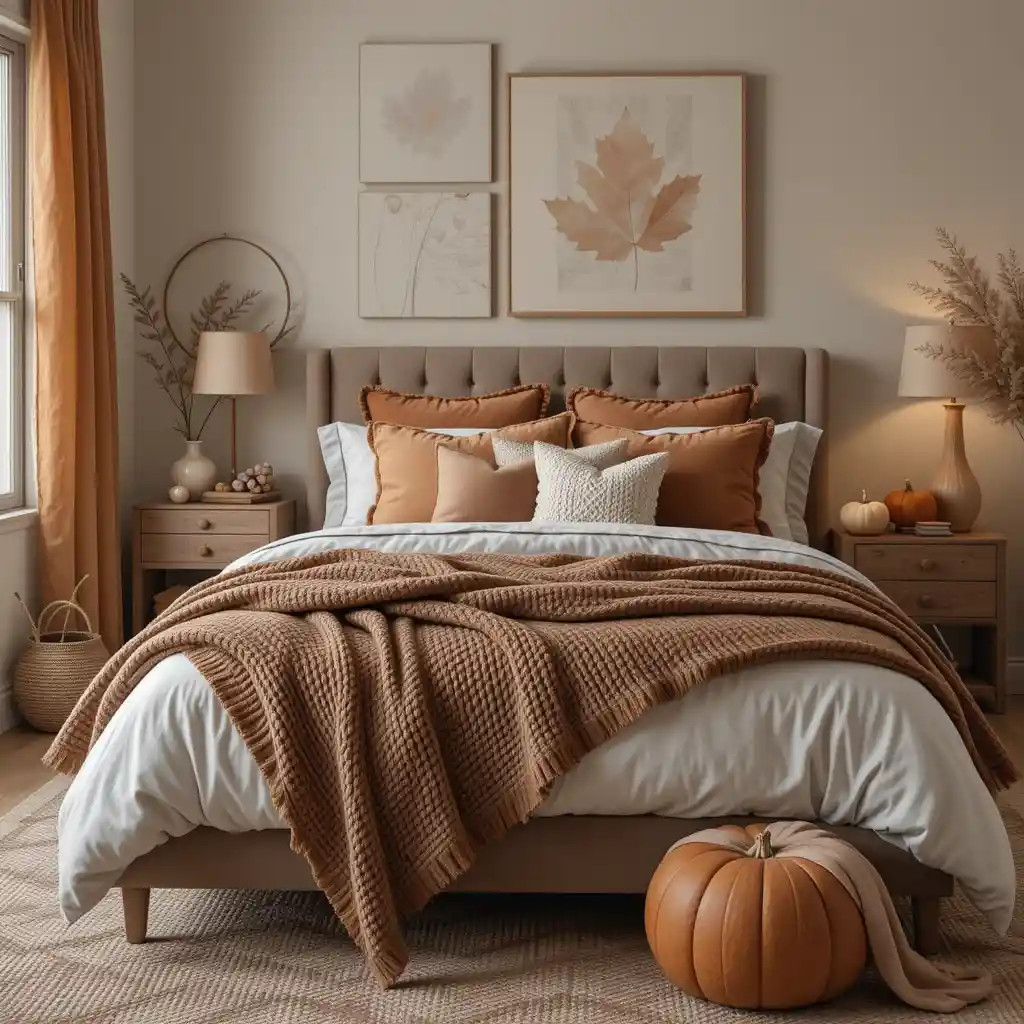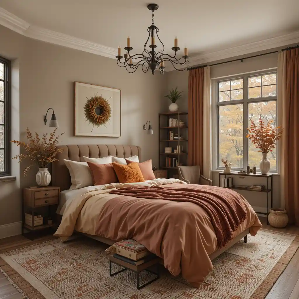 Accent your bedroom with copper light fixtures, amber glass vases, or metallic decor that reflect fall’s golden glow and add a touch of elegance.