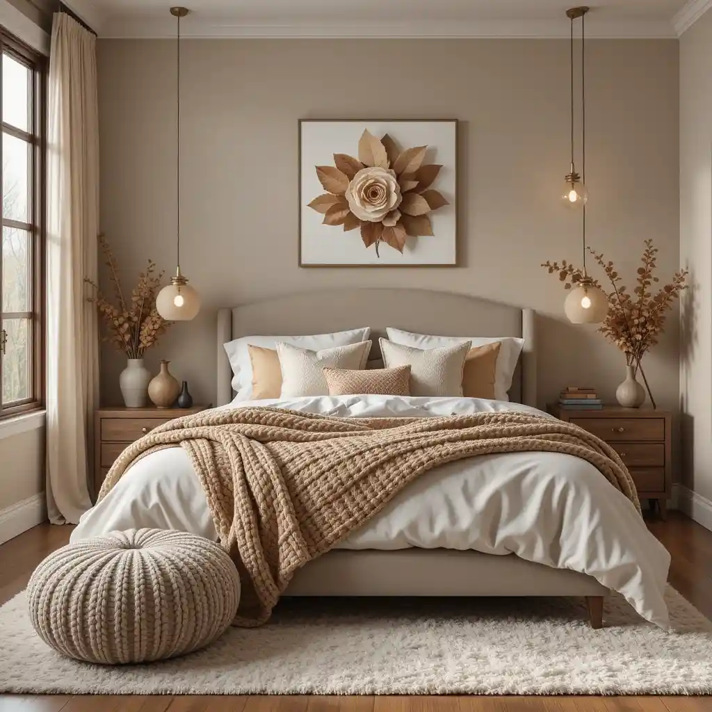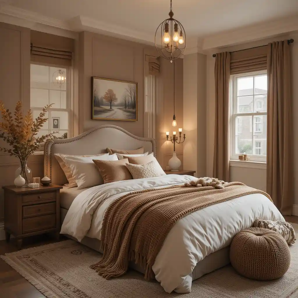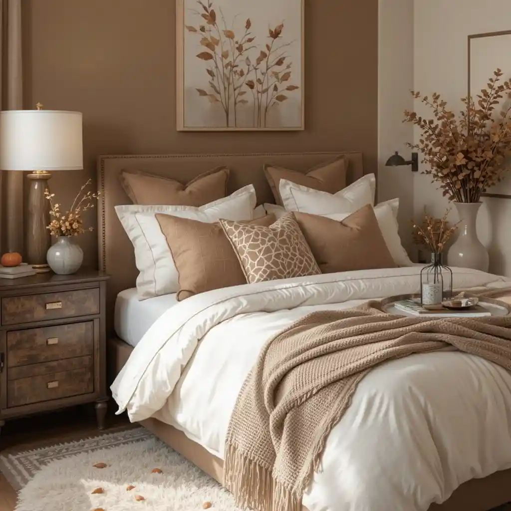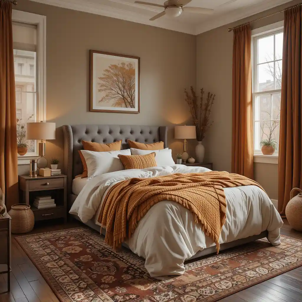 Accent your bedroom with copper light fixtures, amber glass vases, or metallic decor that reflect fall’s golden glow and add a touch of elegance.