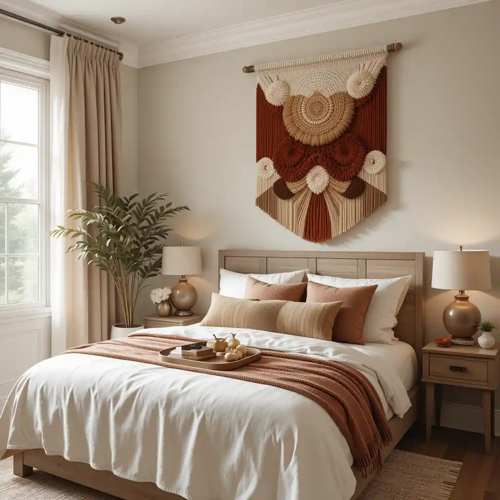 Woven textile art in muted reds, ochre, and cream brings warmth and personality to your wall without overwhelming the space.