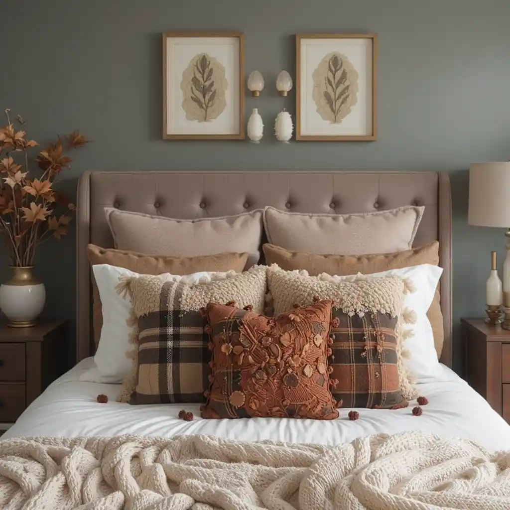 Add knit throws, fleece blankets, and velvet cushions to your bed or reading nook for instant coziness and a plush fall aesthetic that’s irresistibly inviting. Fall Bedroom Aesthetic Ideas