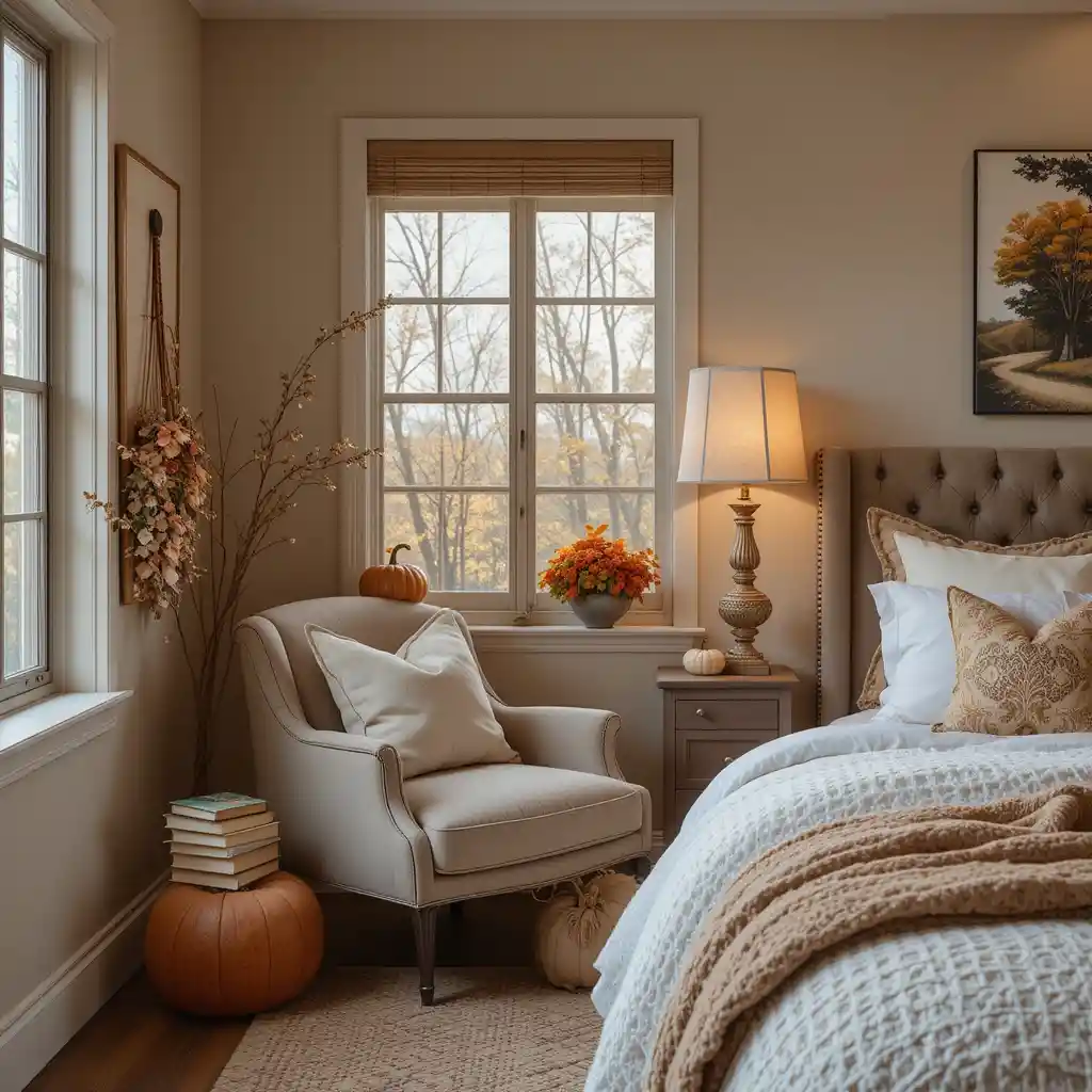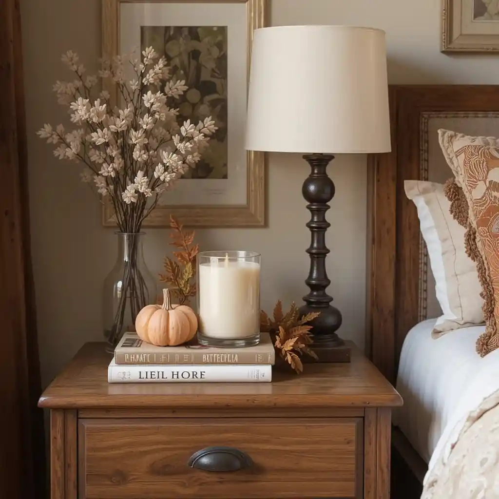 Place a candle, a mini pumpkin, and a small stack of seasonal books on your nightstand to keep the aesthetic flowing throughout the room.