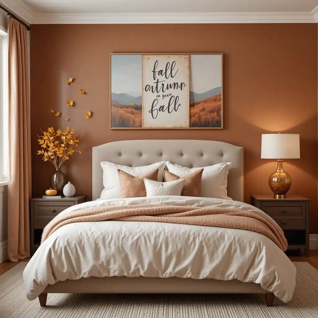 Use a letter board or framed quote with uplifting or cozy fall messages like “Hello Pumpkin” or “Sweater Weather” to add personality and seasonal joy. Fall Bedroom Aesthetic Ideas