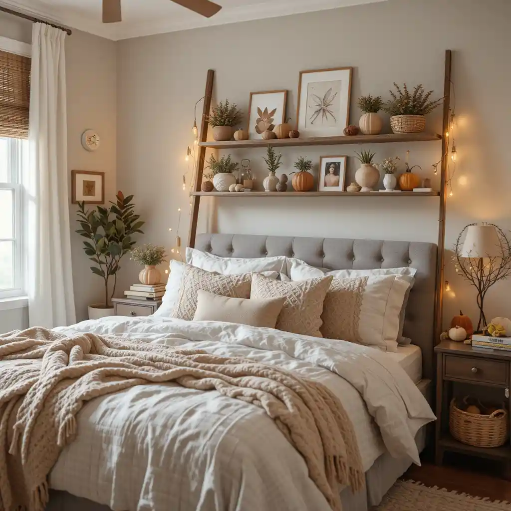 Use a ladder shelf to display cozy throws, small plants, autumn trinkets, and fairy lights that pull the fall aesthetic together without clutter.