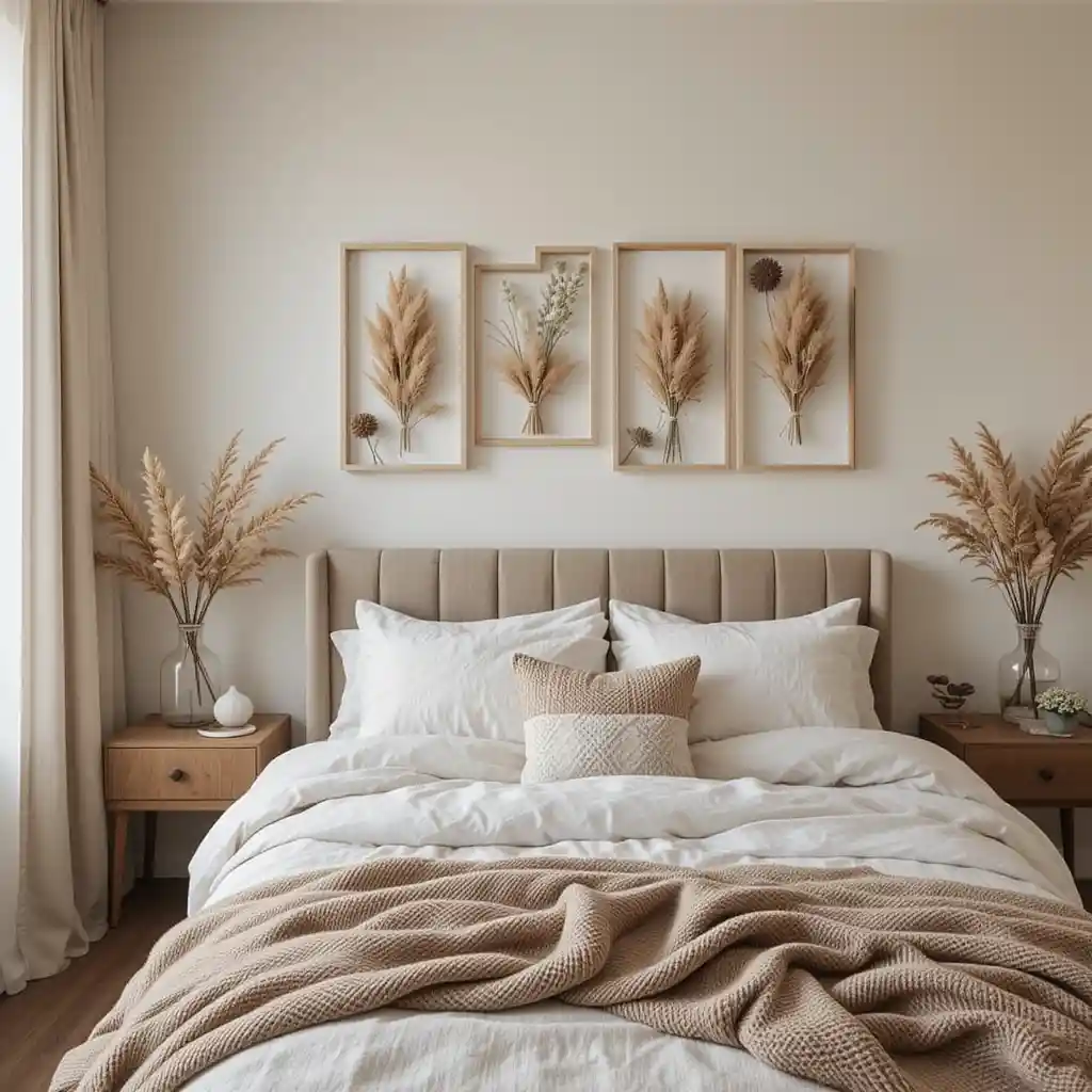 Use dried pampas grass, eucalyptus, or wheat stalks in hanging wall decor or shadowboxes to bring nature indoors with a minimalist touch.