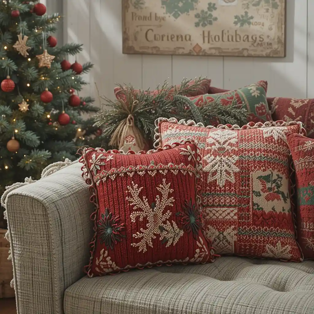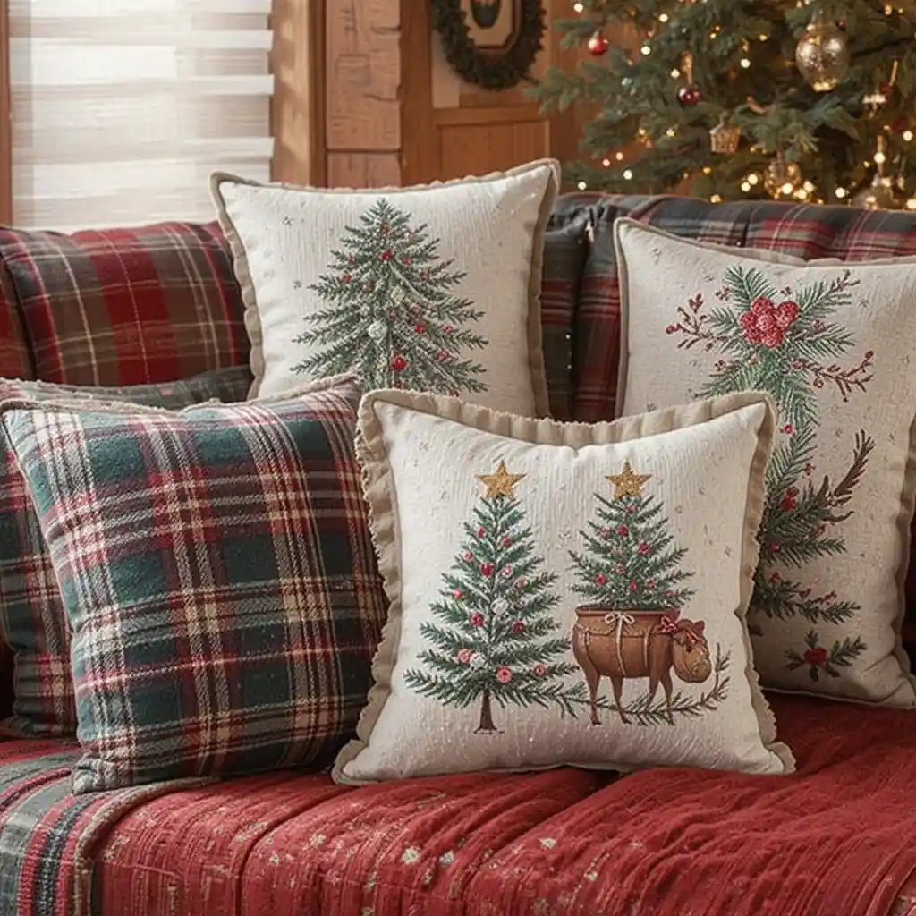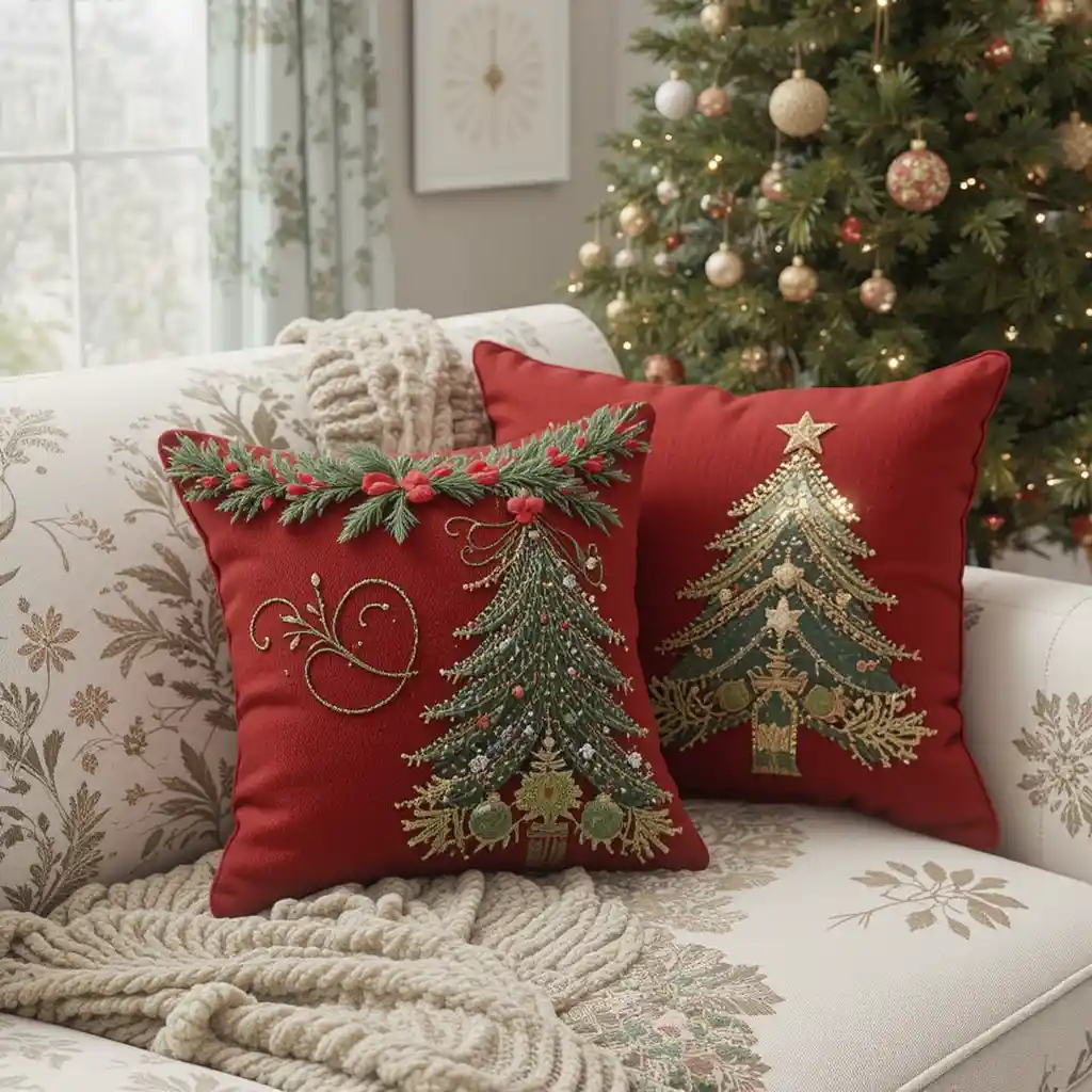 Tree-themed cushions decorated with ornaments and stars highlight the spirit of the season. They’re a classic choice for holiday décor. Christmas Cushion Ideas