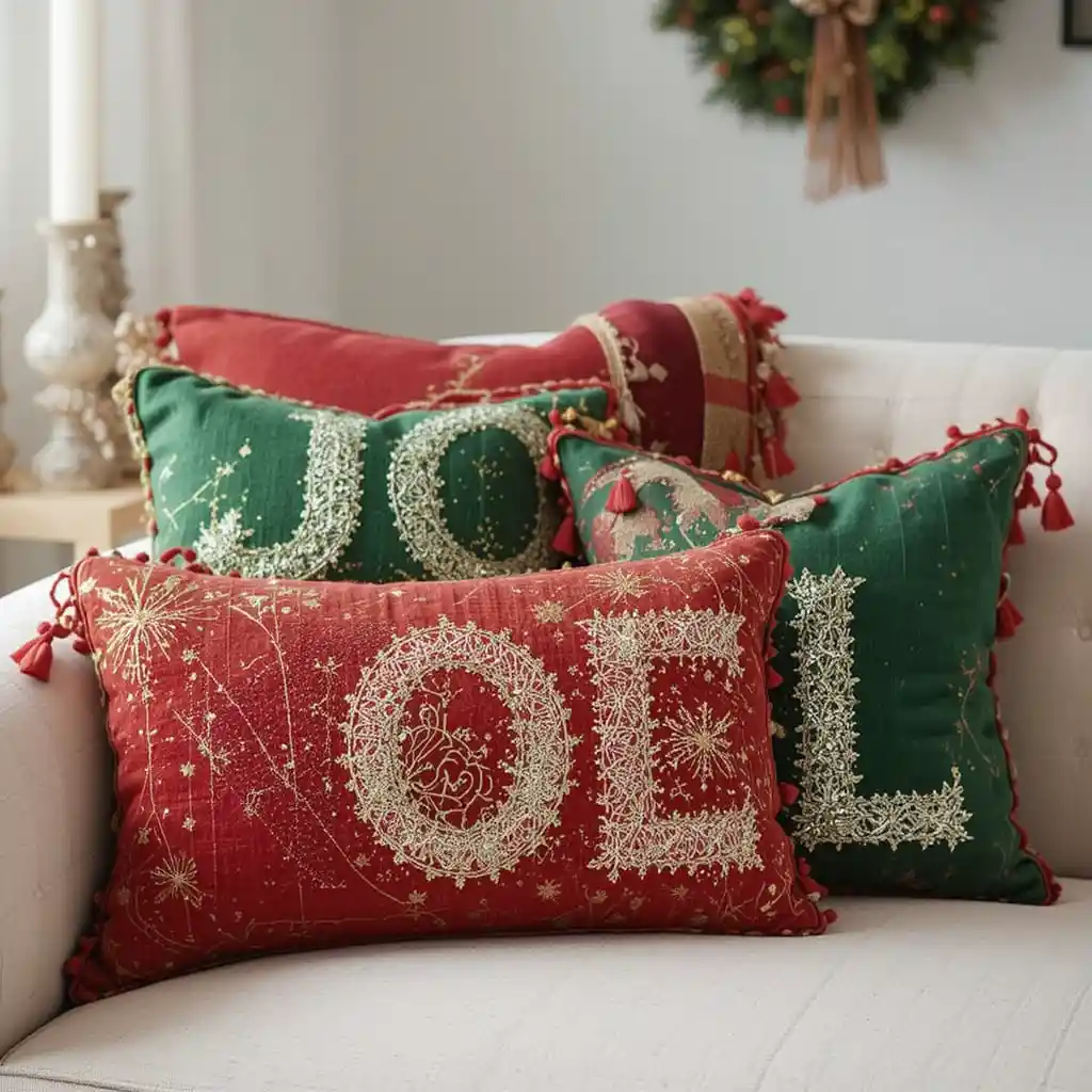 Bold letter cushions spelling “JOY” or “NOEL” with glitter accents create a statement piece for sofas or beds.