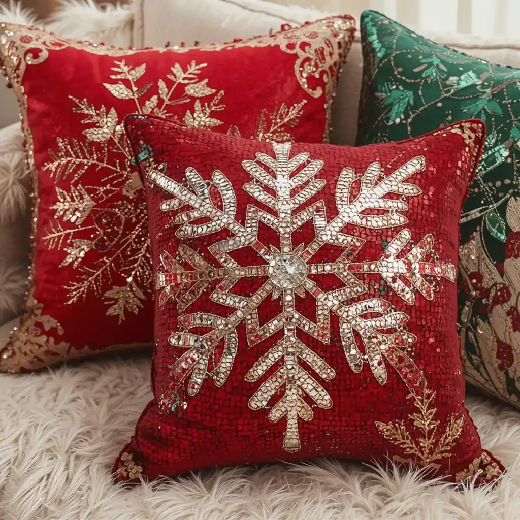 Shiny sequin snowflake designs make cushions sparkle under Christmas lights. They’re eye-catching and add elegance to your holiday setup. Christmas Cushion Ideas