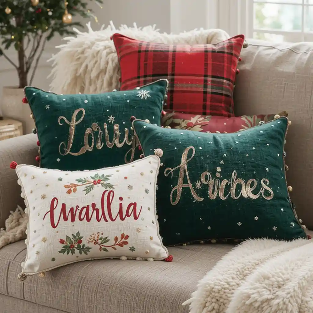 Add a unique twist with custom cushions embroidered with names or initials. They’re thoughtful keepsakes and great for family décor.