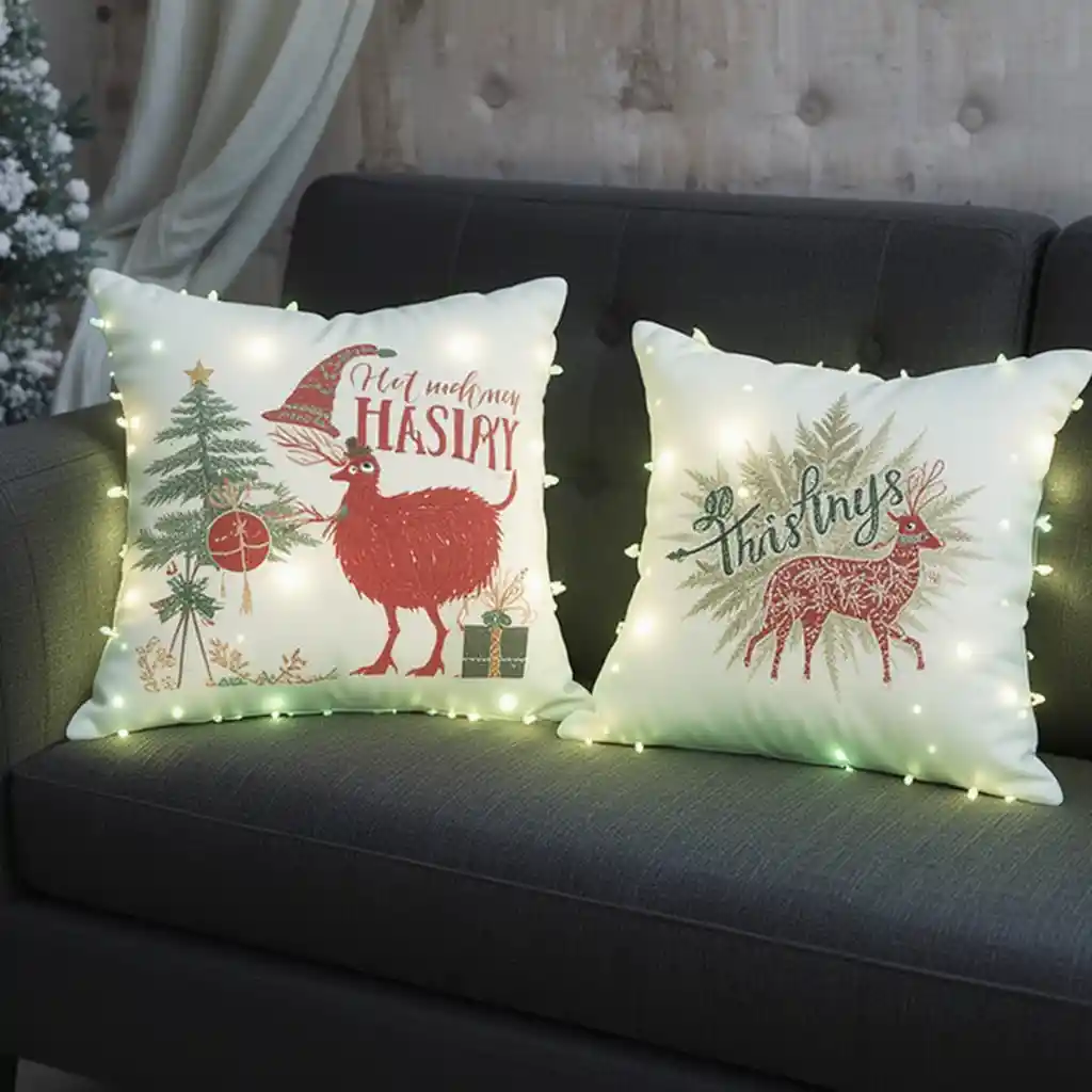 Add magic with LED light-up cushions that glow softly. They’re playful, safe, and look stunning during nighttime gatherings. Christmas Cushion Ideas