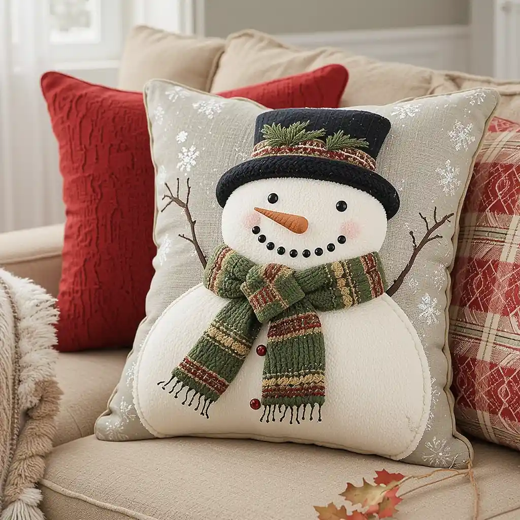 Snowman cushions with scarves and carrot noses bring a whimsical touch. They’re especially fun in children’s bedrooms or playrooms. Christmas Cushion Ideas
