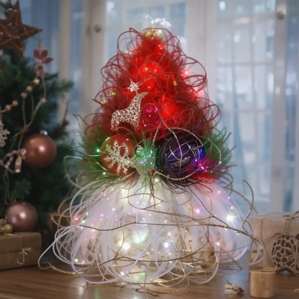 A hat shaped like a Christmas tree decorated with tinsel and mini ornaments is playful and eye-catching. Christmas Hat Ideas