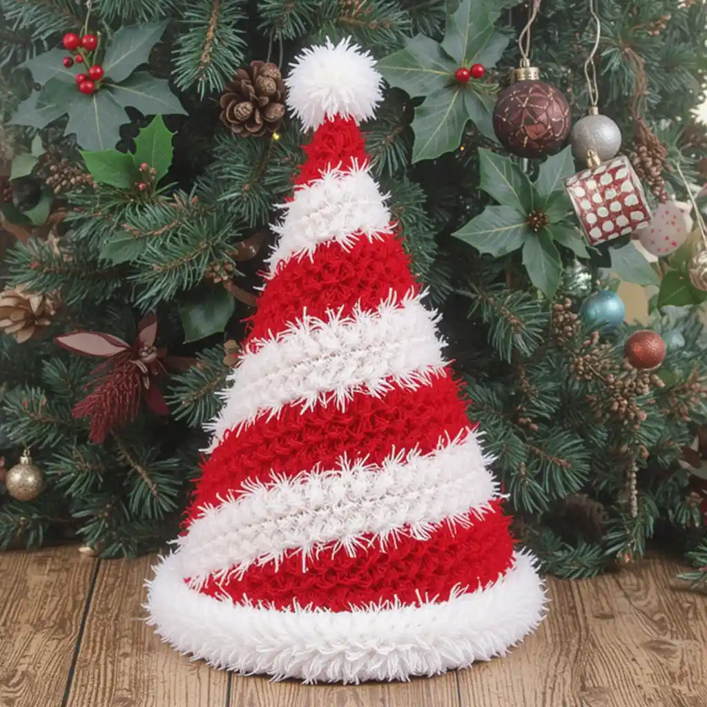 A red-and-white striped hat inspired by candy canes looks cute and whimsical. It’s perfect for kids and adults alike.