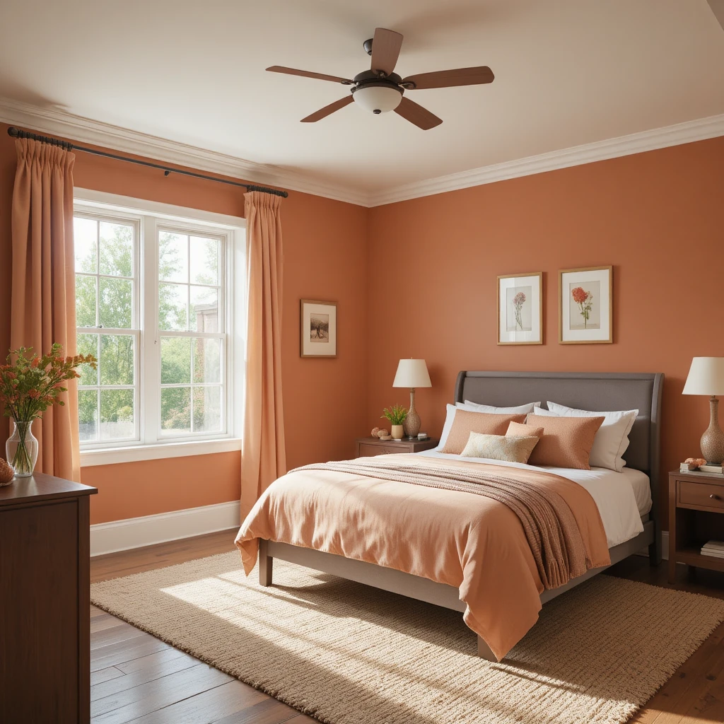 Muted peach-orange ideal for bedrooms. Creates warmth and a relaxing atmosphere. Warm Paint Colors