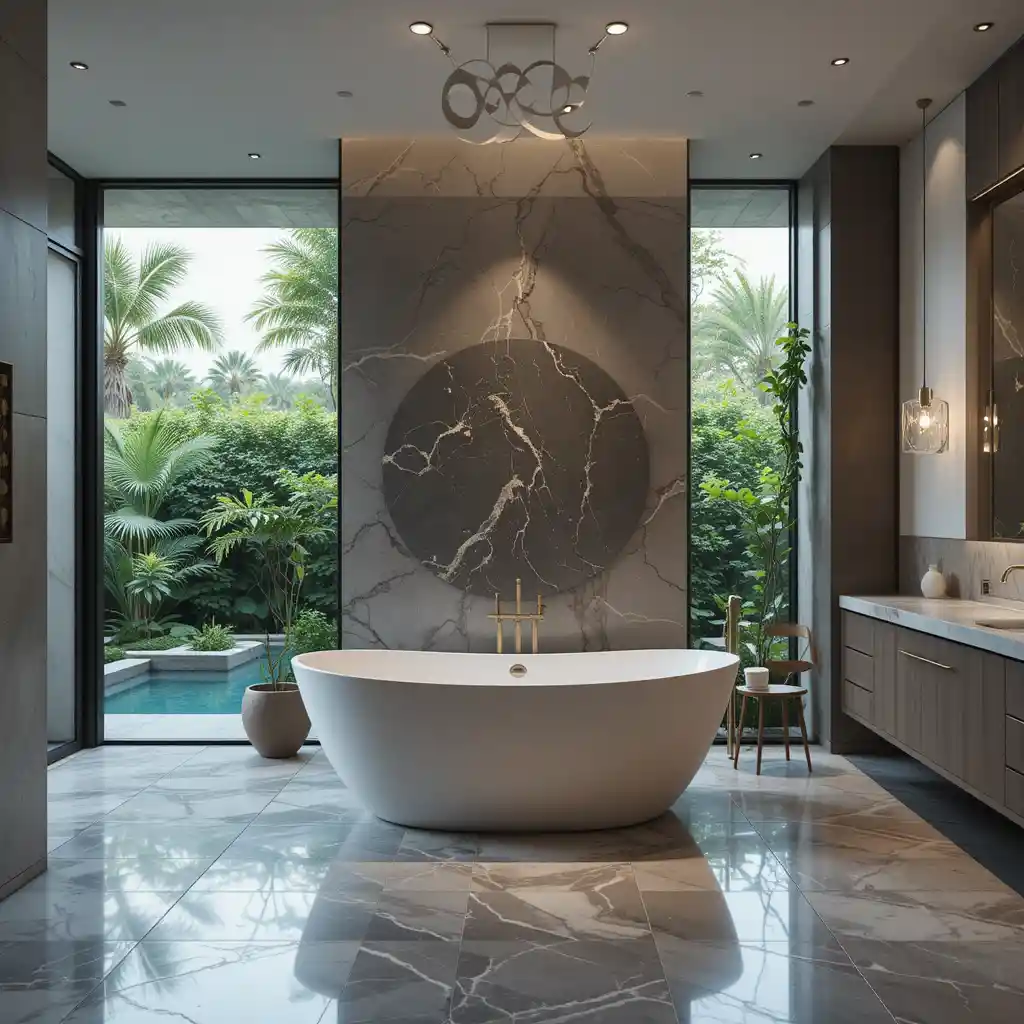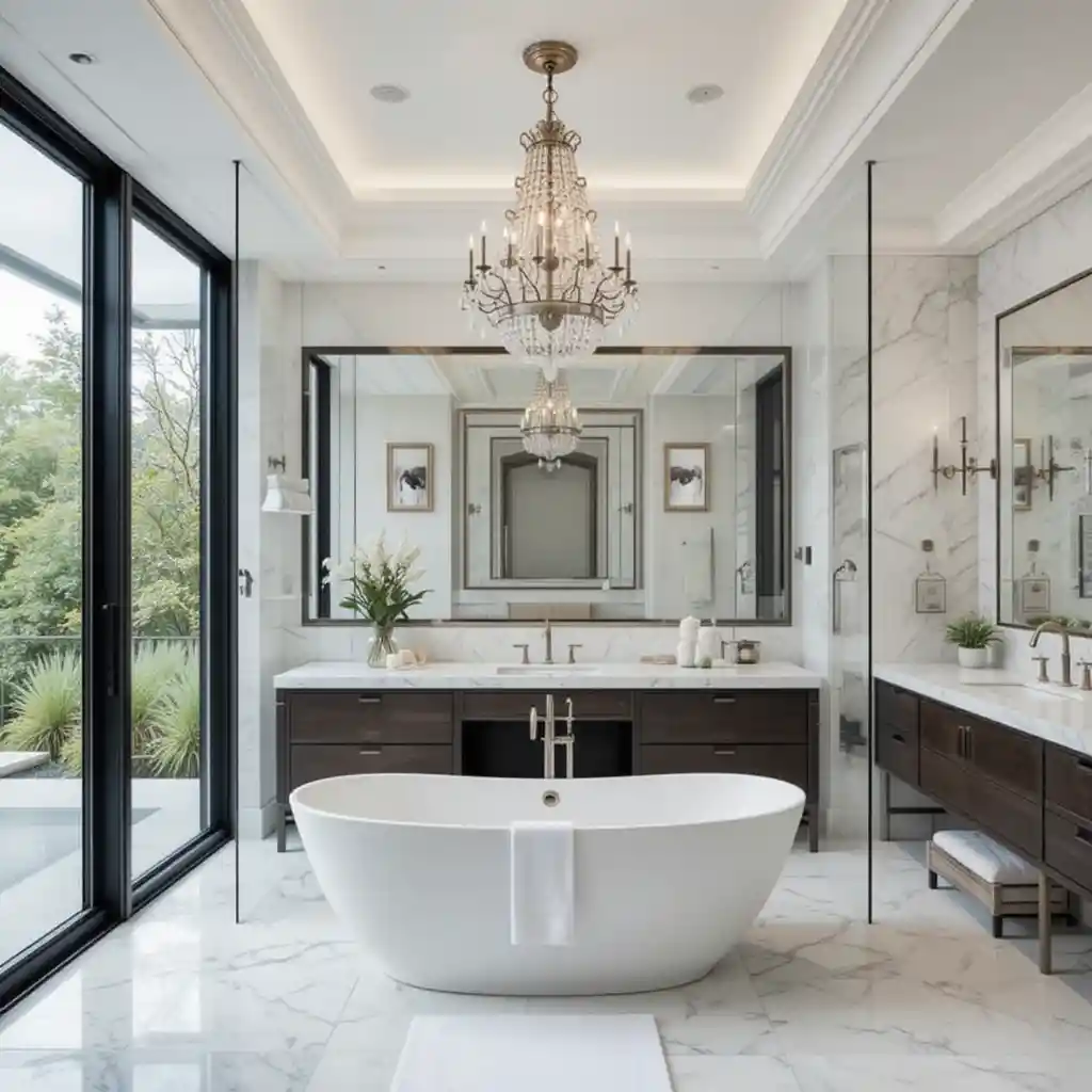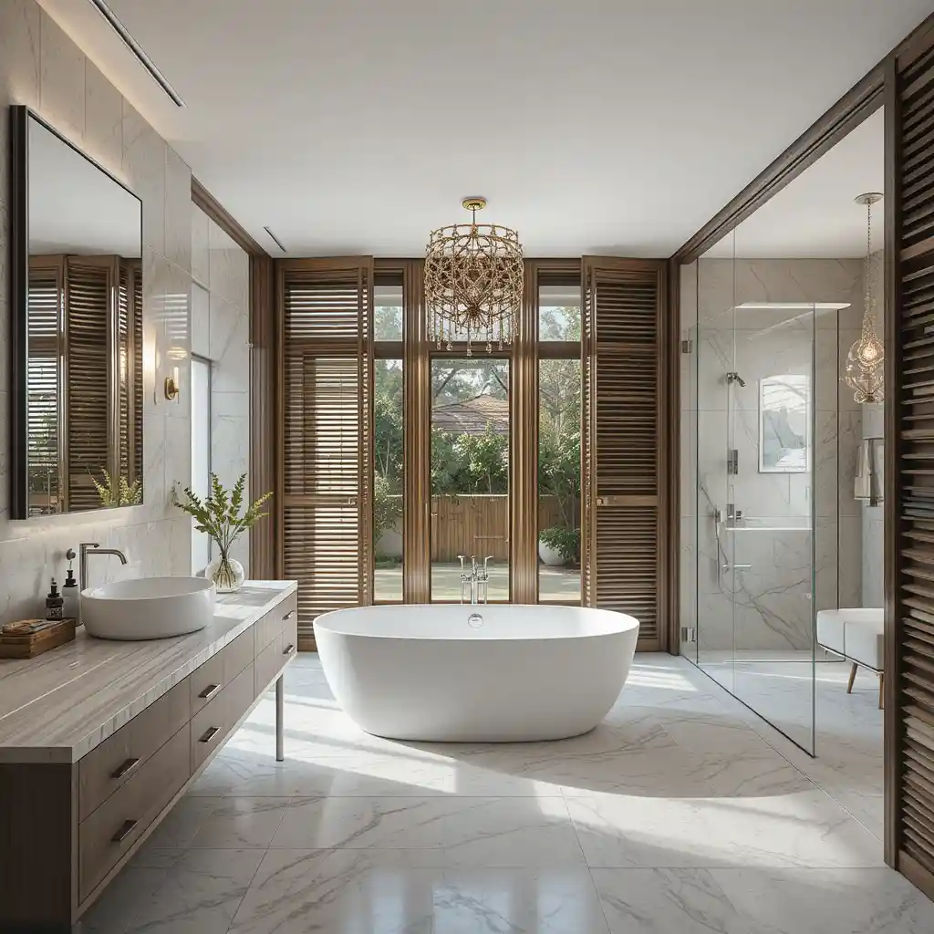 Hang a chandelier or pendant lights above the bathtub to add a dramatic and elegant touch. It defines the area while keeping it open and stylish.