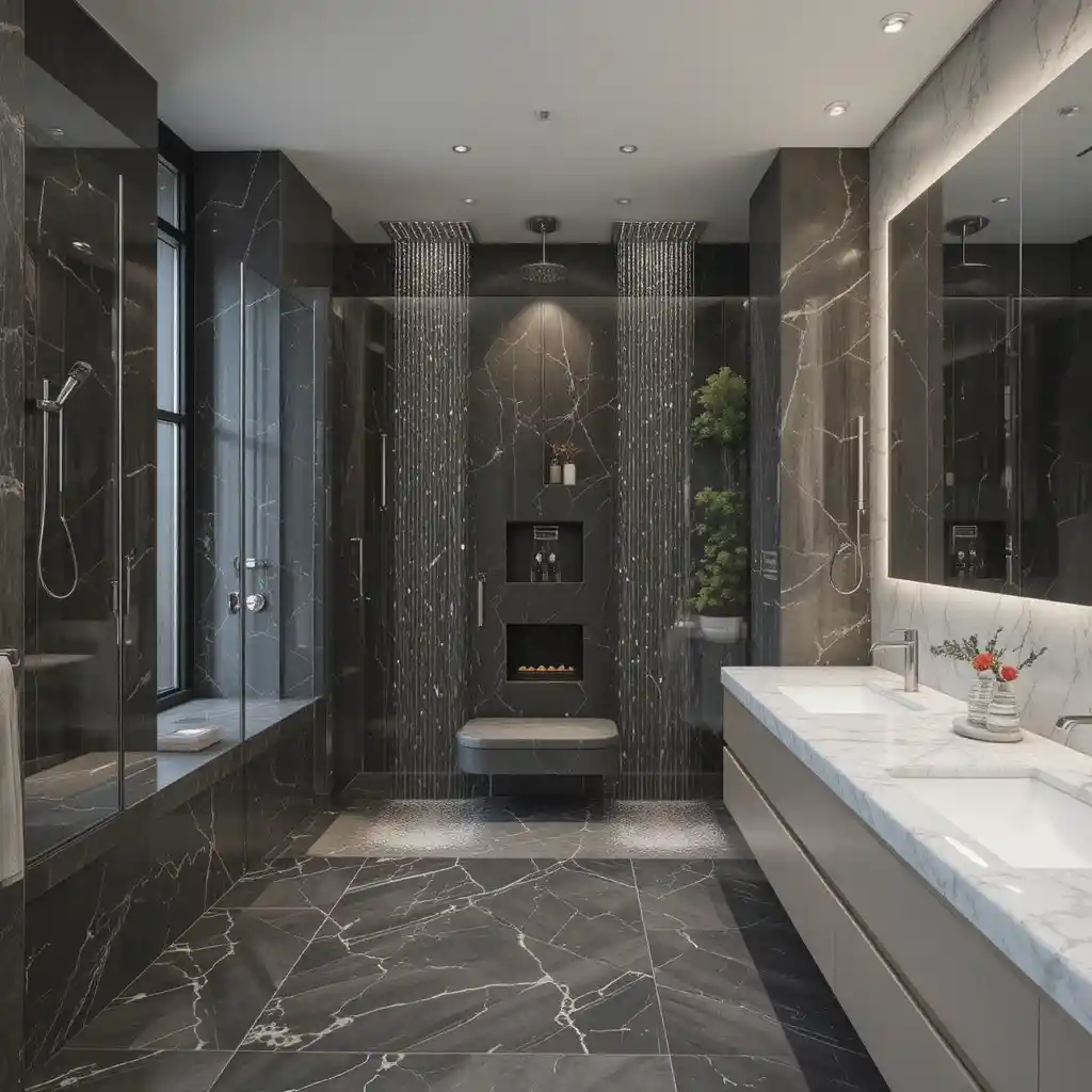 Design an open double shower with separate rain heads and controls. It’s romantic, practical, and perfect for modern couples.