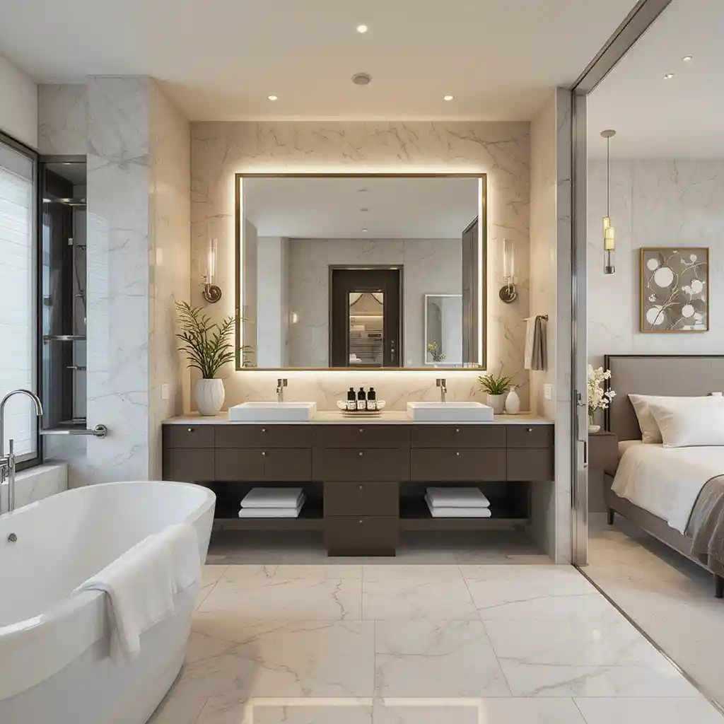 Position the vanity so it faces the bedroom for a luxurious hotel suite vibe. Add a backlit mirror to enhance the glow and create depth.