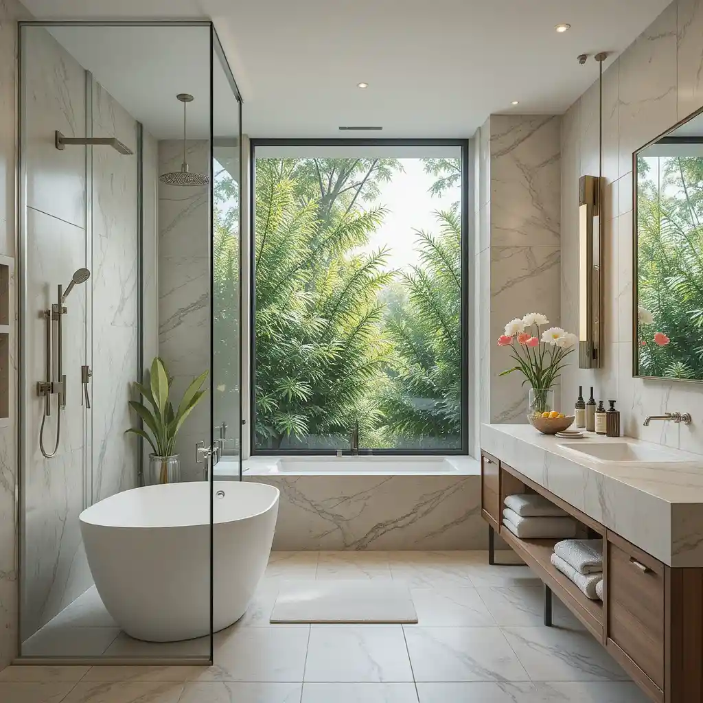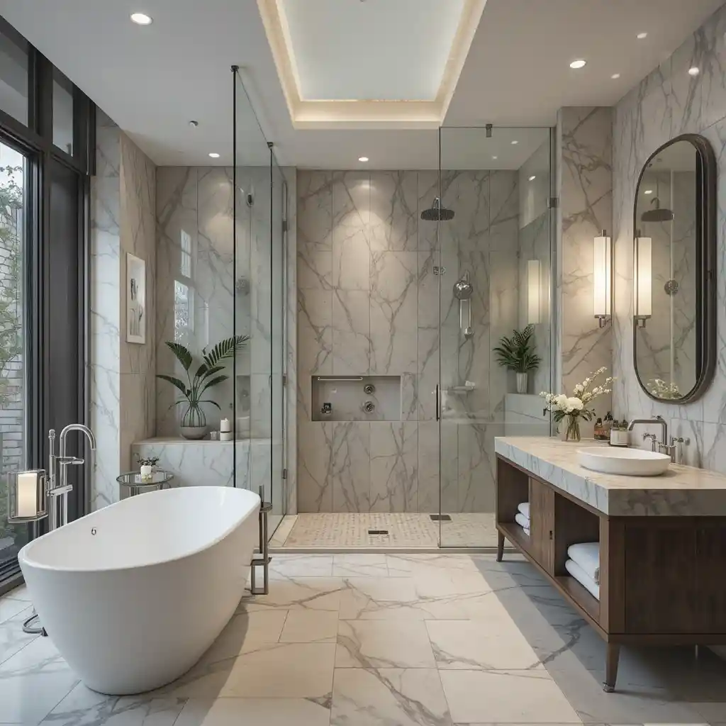 Create a wet room layout where the shower and tub share one open space. Floor-to-ceiling tiles and a single-level surface make it sleek and practical.