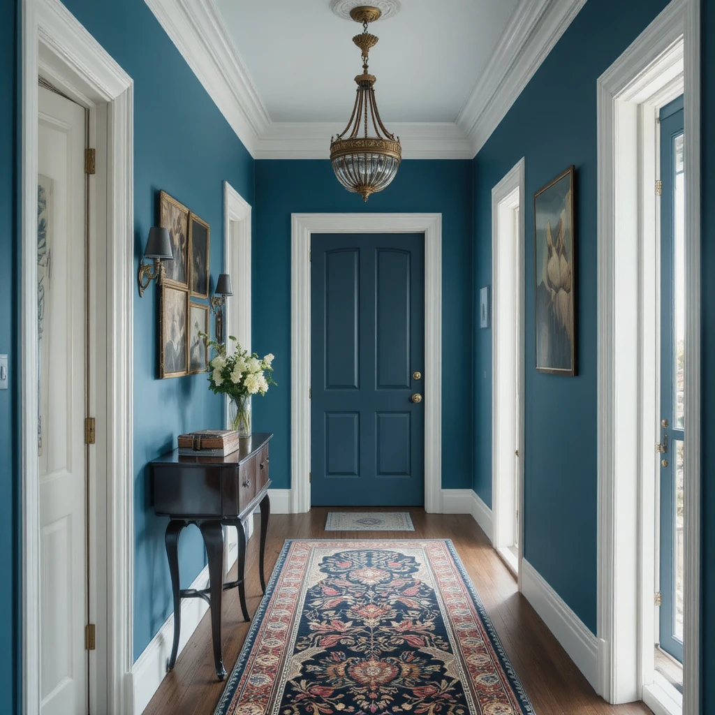 Deep, jewel-toned peacock blue for hallways or transitional spaces. Adds sophistication and character. Peacock Blue Paint Colors
